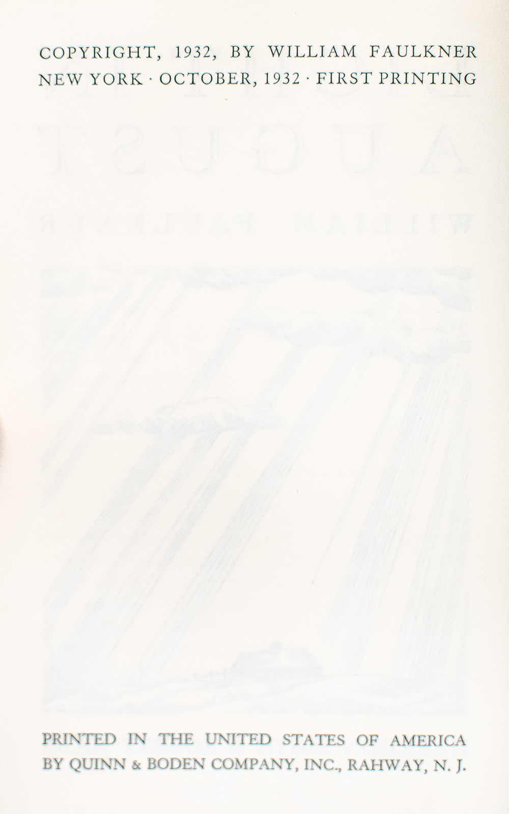 "Memory believes before knowing remembers": First Edition of William Faulkner’s Light In August; In the Rare Original Dust Jacket and Glassine
