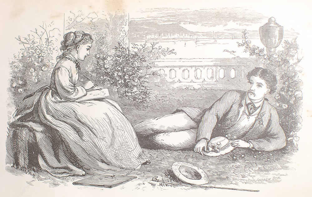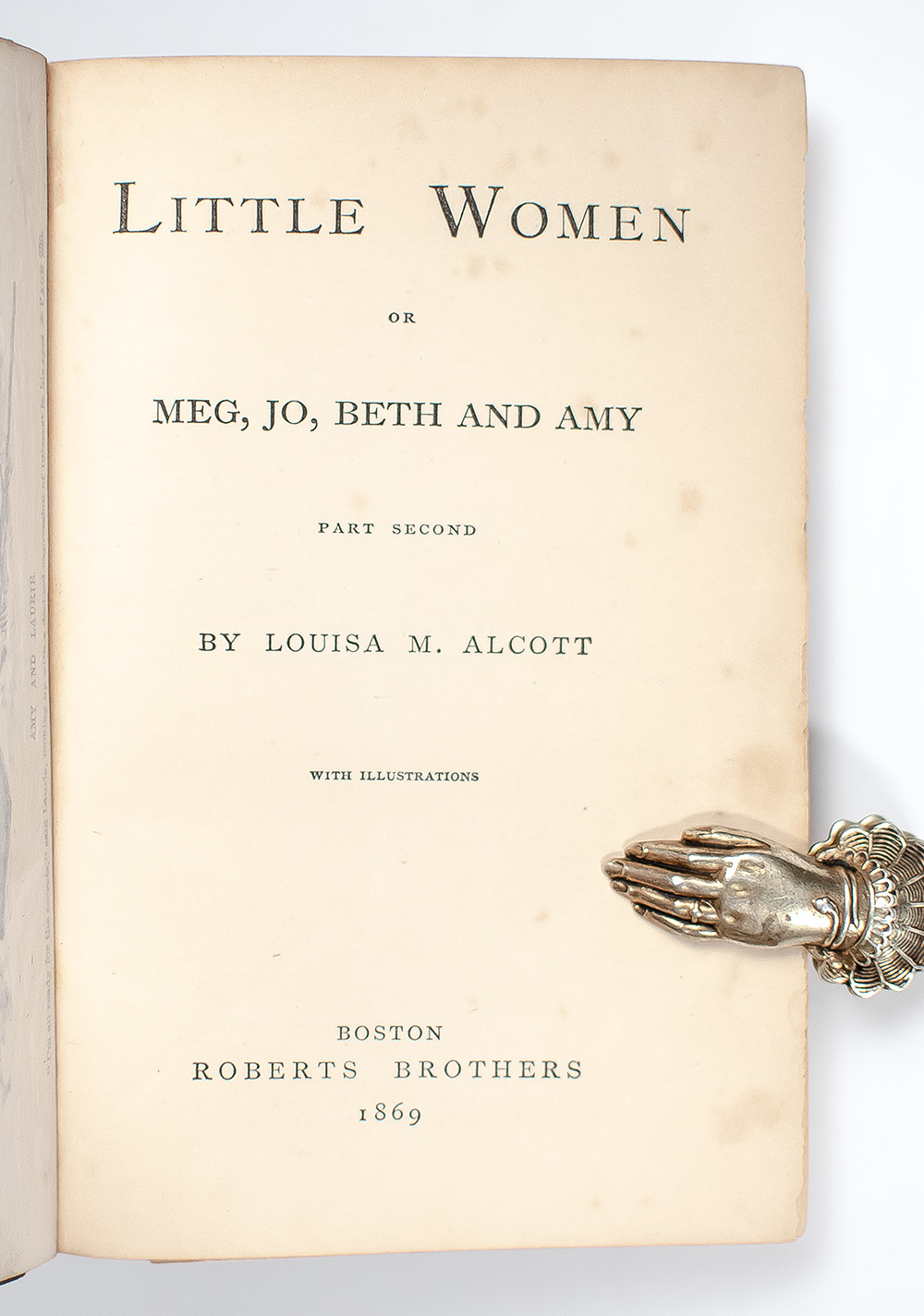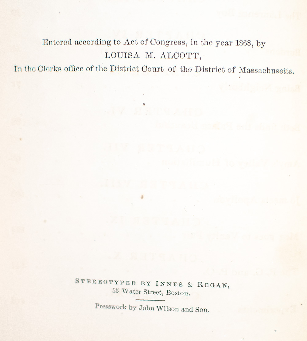 Louisa May Alcott was born in Germanstown, Pennsylvania and spent most of her life in Massachusetts. Educated by her father, the philosopher and writer, Amos Bronson Alcott, she began writing to help support her family. She too, like her heroine Jo, wrote stories for pulp magazines under a male pseudonym. The illustrations were by her sister May, upon whom the character of Amy was based. In 1865, while serving as editor of Merry Museum, a Boston children’s magazine, Alcott received encouragement to write a book for girls. Drawing on memories of childhood, the author portrayed the daily lives of Amy, Jo, Beth and Meg March—portraits of the four Alcott sisters. One of the most popular juvenile books ever published, “Little Women is an outstanding achievement of 19th-century American literature, and the first children’s novel written in that country to have become an enduring classic.” “It is one of the first fictional texts for children to convey the difficulties and anxieties of girlhood, and… suggests that becoming a ‘little woman’ is a learned and often fraught process, not an instinctual or natural condition of female development” (Foster & Simon, 87). Published separately in consecutive years, the first part of Little Women “did not sell at first. Part Second was therefore also issued in a small edition, but it went like wildfire, and pulled Part First along with it” (Grolier 74). The original issues of each part are therefore quite rare. Each volume is illustrated with a frontispiece and three plates; those in the first part of Little Women were created by the author’s sister, May. First issue of Little Women with all points, including Little Women priced at $1.25 in terminal advertisements.