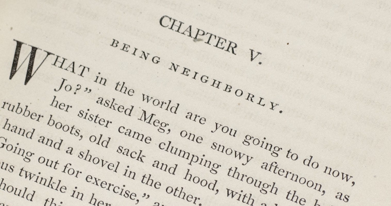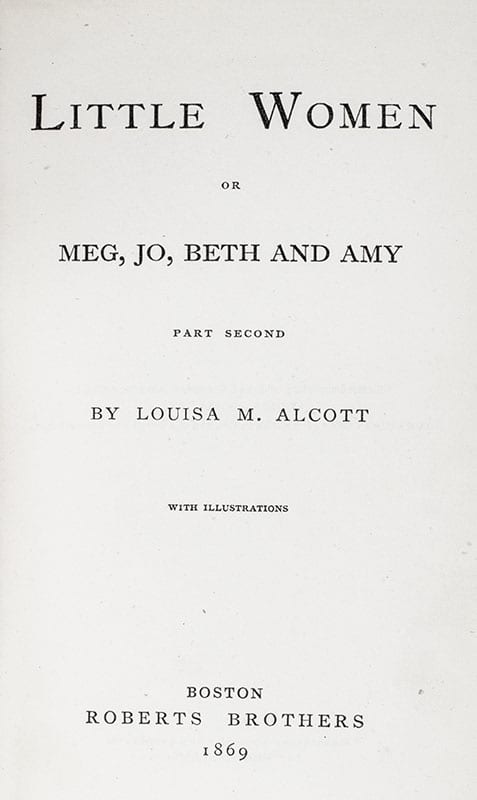 Louisa May Alcott was born in Germanstown, Pennsylvania and spent most of her life in Massachusetts. Educated by her father, the philosopher and writer, Amos Bronson Alcott, she began writing to help support her family. She too, like her heroine Jo, wrote stories for pulp magazines under a male pseudonym. The illustrations were by her sister May, upon whom the character of Amy was based. In 1865, while serving as editor of Merry Museum, a Boston children’s magazine, Alcott received encouragement to write a book for girls. Drawing on memories of childhood, the author portrayed the daily lives of Amy, Jo, Beth and Meg March—portraits of the four Alcott sisters. One of the most popular juvenile books ever published, “Little Women is an outstanding achievement of 19th-century American literature, and the first children’s novel written in that country to have become an enduring classic.” “It is one of the first fictional texts for children to convey the difficulties and anxieties of girlhood, and… suggests that becoming a ‘little woman’ is a learned and often fraught process, not an instinctual or natural condition of female development” (Foster & Simon, 87). Published separately in consecutive years, the first part of Little Women “did not sell at first. Part Second was therefore also issued in a small edition, but it went like wildfire, and pulled Part First along with it” (Grolier 74). The original issues of each part are therefore quite rare. Each volume is illustrated with a frontispiece and three plates; those in the first part of Little Women were created by the author’s sister, May. First issue of Little Women with all points, including Little Women priced at $1.25 in terminal advertisements;