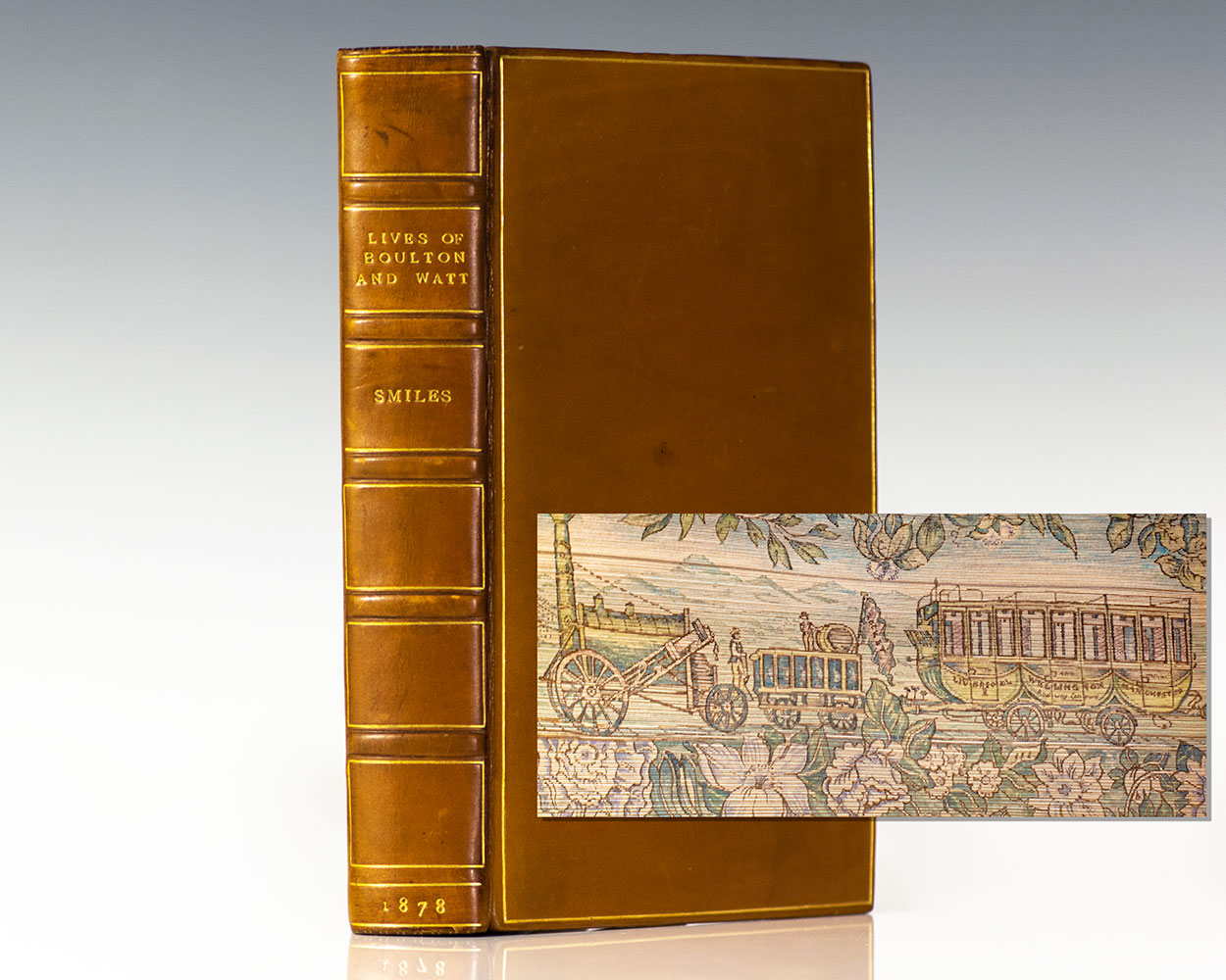 Finely bound example of Smiles' work on Boulton and Watt. Octavo, bound in full polished calf by John Bumpus with gilt titles and ruling to the spine, gilt turn-ins and inner dentelles, all edges gilt, ribbon bound in. Decorated with a beautiful disappearing fore-edge painting of a steam locomotive. In near fine condition. A very nice example.