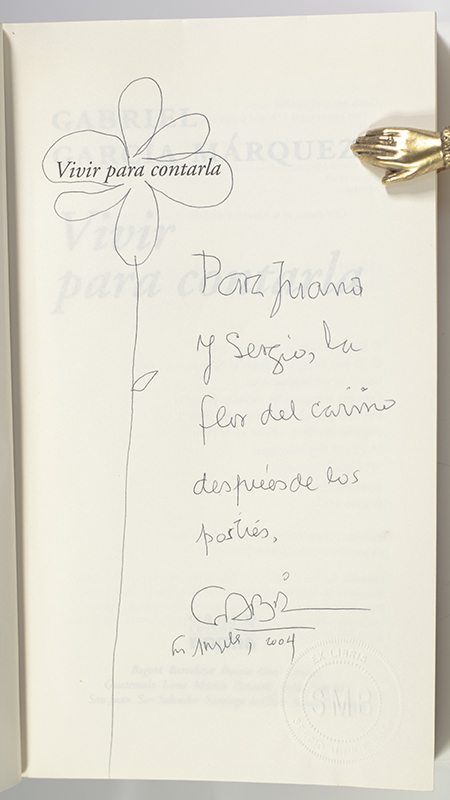 First edition in Spanish of the Nobel Prize-winning author's memoir. Octavo, original illustrated wrappers. Association copy, inscribed by the author on the half-title page with a large drawing of a flower, "Para Juana y Sergio, la flor del carino despues de los postres Gabriel Garcia Marquez Los Angeles, 2004." (In English it reads, "the flower of love after dessert). Garcia Marquez has also underlined the dedication of this work. The recipient, Sergio Muñoz Bata and his wife Juana, were close friends of Marquez. They met in 1964 in Mexico City in the home of author Carlos Fuentes, who often hosted a literary open house or "salon" on Sundays. At the time, Marquez was largely unknown to the literary world and still a "starving artist." Even after his fame, however, Marquez remained very down-to-earth, and the men stayed close friends for over 50 years. When Muñoz Bata moved to Los Angeles in the late 1970's, they continued to get together regularly with their wives after Marquez purchased a home there. Sergio Muñoz Bata writes a weekly syndicated column published in 18 newspapers across 11 countries in the hemisphere. He is also both a former Los Angeles Times editorial board member and Executive Editor of La Opinión. In near fine condition. A wonderful association copy with great provenance. In near fine condition.