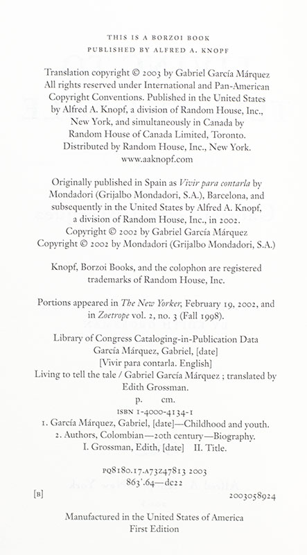 First edition in English of the Nobel Prize-winning author's memoir. Octavo, original boards. Boldly signed by Gabriel Garcia Marquez on the half-title page. Fine in a fine dust jacket. Jacket design by Carol Devine Carson. Translated by Edith Grossman.