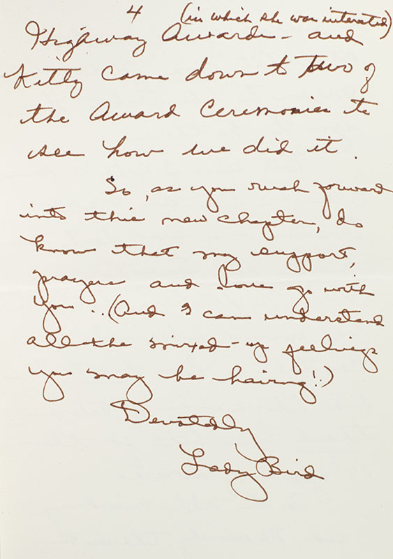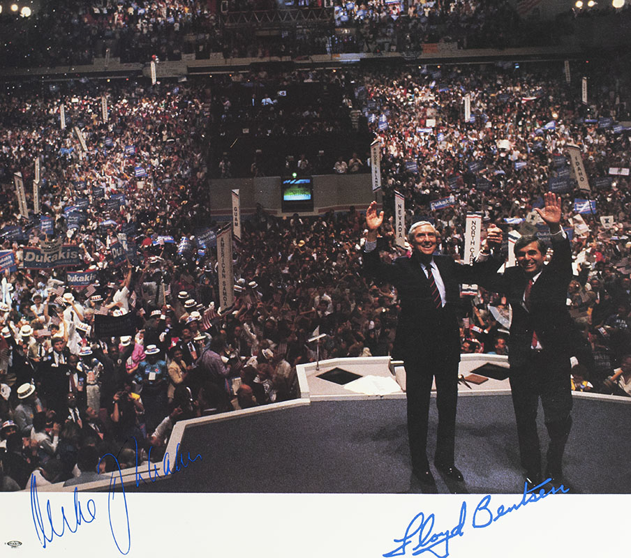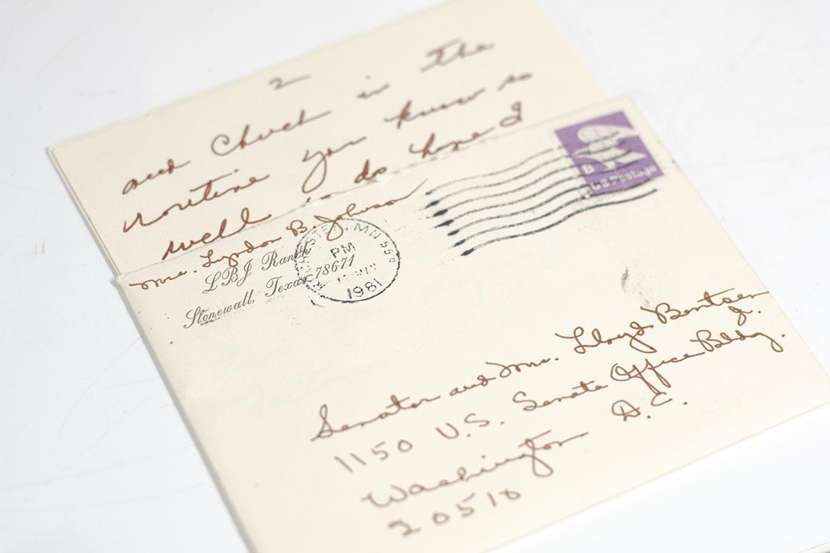 Rare archive of autograph letters, photographs, and commemorative stamp folios from the collection of former United States Secretary of the Treasury Lloyd Millard Bentsen. The archive includes a photograph of Bentsen with Jimmy Carter, inscribed by Carter to him, "Thanks & best wishes to my good friend Lloyd Bentsen - Jimmy Carter 2-21-80", two autograph letters and one typed letter signed by Lady Bird Johnson to Bentsen and his wife Beryl Ann thanking them for recent visits to the LBJ ranch, an autograph note signed by Kitty Dukakis regarding Lloyd Sr.'s passing, two commemorative stamp folios with autograph notes laid in signed by the Postmaster General, a commemorative autograph photograph singed by Bentsen and a U.S. Congressional Coin. In fine condition. A unique and revealing archive.