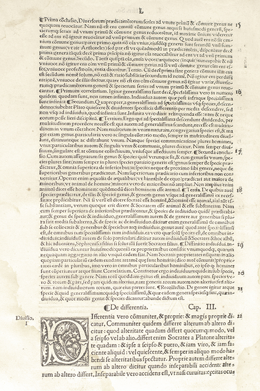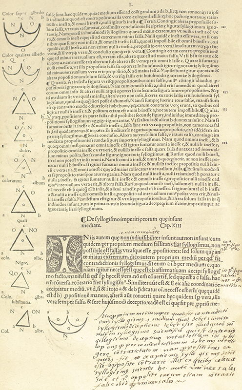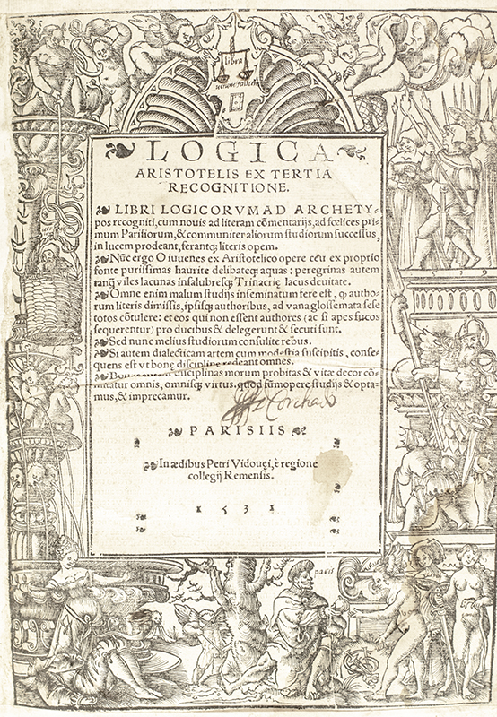 Rare 16th century French printing of Aristotle's third book of logic. Folio, bound in full vellum, elaborate woodcut vignette-border title-page, illustrated with numerous in-text woodcut diagrams, and woodcut initials. Ownership inscriptions, including that of American philosopher Allan Gotthelf. Gotthelf received many honors for his work on Aristotle, including in 2004 an international conference on "Aristotle on Being, Nature, and Life", held "in celebration of his contributions to the study of classical philosophy and science." In very good condition with some dampstaining and period marginalia throughout.