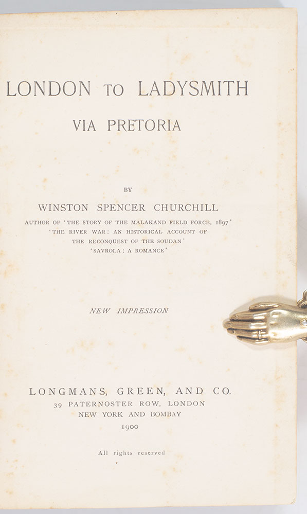 When the Boer settlers in South Africa rebelled against British authority, Churchill joined with the 21st Lancers and "secured an assignment as press correspondent to the Morning Post… He had scarcely arrived [in South Africa] before he was involved in a skirmish which found him 'in durance vile': a prisoner of war in Pretoria, unable to talk himself out of prison by claiming to be a reporter, and nearly mad over the lack of action. Typically, he made a daring escape… The true-life adventure story of his successful escapade dominates this book, one of the most gripping in the canon, making this one of his most popular books" (Langworth).
