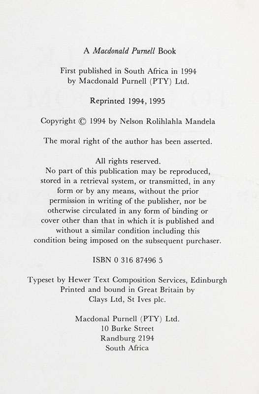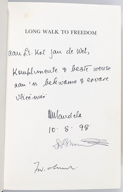 First South African edition, early printing of this classic autobiography, which has went on to sell over six million copies worldwide. Octavo, original black cloth, cartographic endpapers, illustrated with photographs. Association copy, inscribed by the author on the half-title page (translated from Afrikaans to English), "To Lieutenant Colonel Jan de Wet, Compliments and Best Wishes to a competent and experienced pilot NMandela 10.5.95." This was signed on the first anniversary of Mandela's inauguration as President. Additionally signed by fellow Nobel laureates Desmond Tutu and F.W. de Klerk. Desmond Tutu was awarded the Nobel Peace Prize in 1984 for his efforts in resolving and ending apartheid. In 1993, Mandela and de Klerk were jointly awarded the Nobel Peace Prize for their work in ending apartheid. After the first universal elections in 1994, de Klerk became deputy president in the government of national unity under Nelson Mandela, a post he kept until 1996. In 1997 he resigned the leadership of the National Party and retired from politics. Fine in a near fine dust jacket.