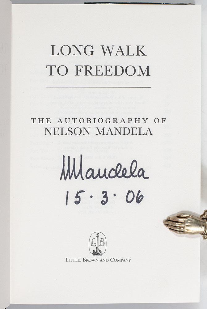 First South African edition of this classic autobiography, which has went on to sell over six million copies worldwide. Octavo, original black cloth, cartographic endpapers, illustrated with photographs. Boldly signed on the title page by the author, "NMandela 15.3.06" and additionally signed by "Mac Maharaj 20 Sept 2007" on the verso of the front free endpaper. Maharaj was a political activist and member of the then banned South African Communist Party, who worked in a clandestine manner on anti-apartheid activities with Nelson Mandela. In July 1964, Maharaj was arrested in Johannesburg, charged and convicted with four others including Laloo Chiba and Wilton Mkwayi on charges of sabotage in the little Rivonia Trial, and was imprisoned on Robben Island with Mandela, Walter Sisulu, Govan Mbeki and other revolutionary prisoners. In prison he secretly transcribed parts of Mandela's memoir Long Walk to Freedom and smuggled it out of the prison in 1976.Fine in a near fine dust jacket. A unique example.