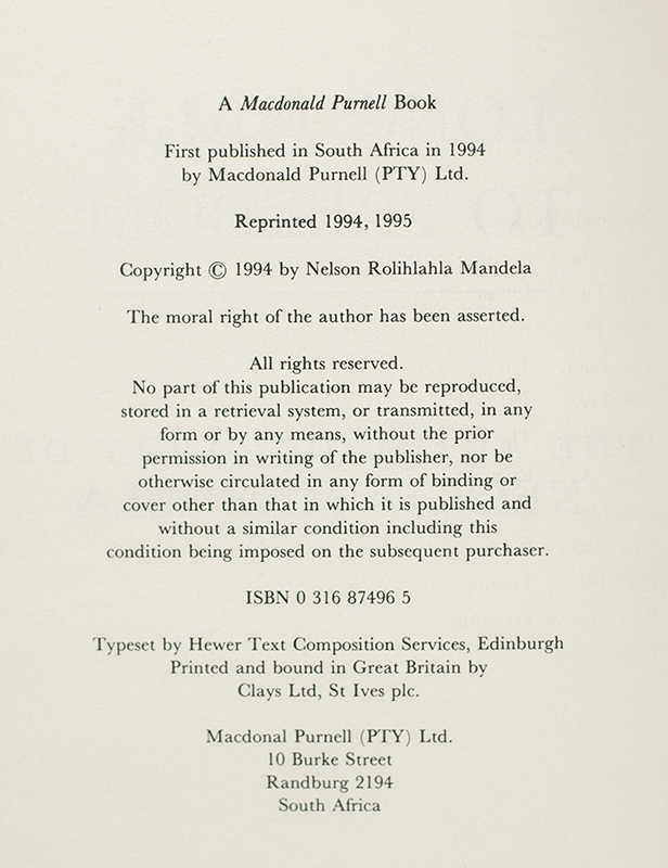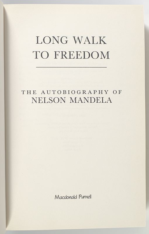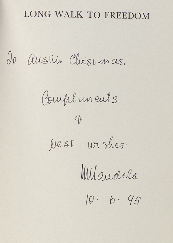 First South African edition, early printing of this classic autobiography, which has went on to sell over six million copies worldwide. Octavo, original black cloth, cartographic endpapers, illustrated with photographs. Presentation copy, inscribed by the author on the half-title page, "To Austin Christmas Compliments and best wishes NMandela 10.6.95." Fine in a near fine dust jacket.