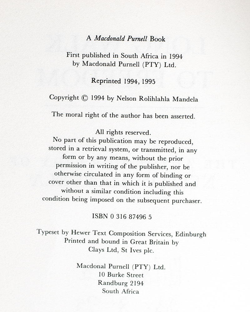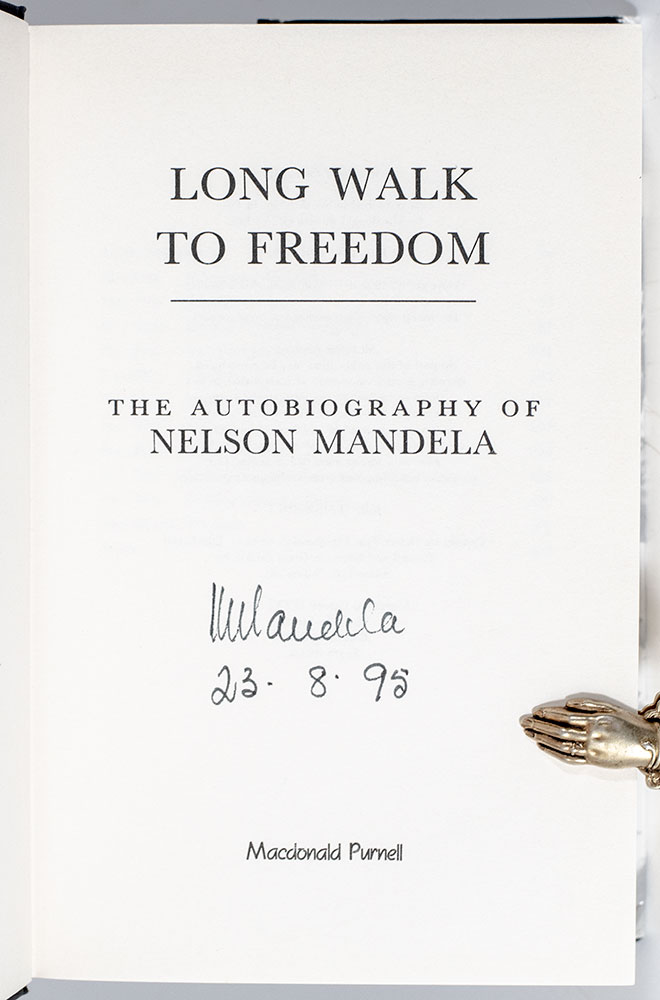 First South African edition, early printing of this classic autobiography, which has went on to sell over six million copies worldwide. Octavo, original black cloth, cartographic endpapers, illustrated with photographs. Boldly signed on the title page by the author, "NMandela 23.8.95."Fine in a near fine dust jacket.