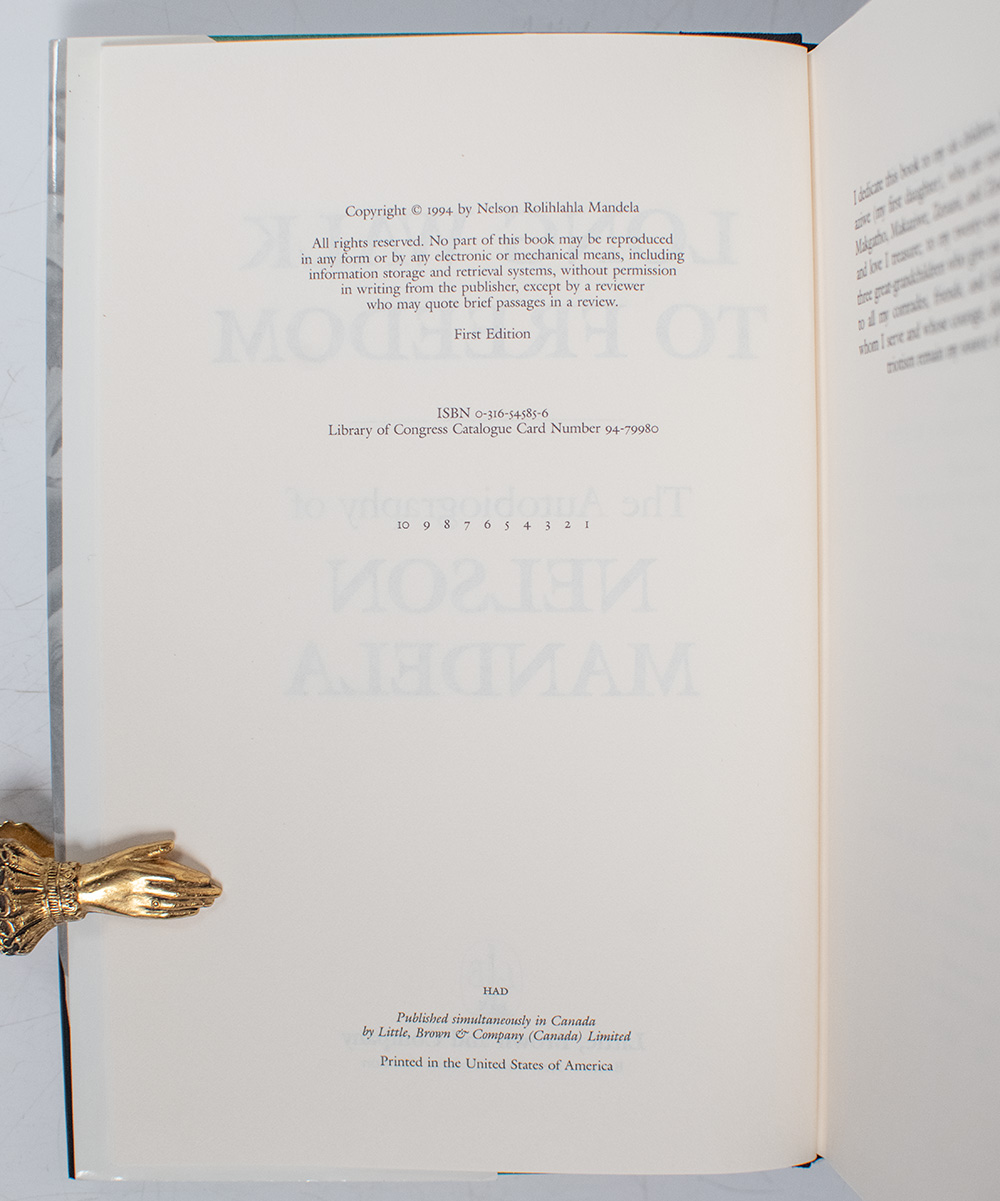 First American edition of this classic autobiography that has went on to sell more than six million copies worldwide. Octavo, original half cloth, cartographic endpapers, illustrated. Signed "Nelson Mandela 25.5.95" on a Nelson Mandela Children's Fund bookplate (not attached). Near fine in a near fine price-clipped dust jacket. Jacket design by Martha Kennedy.