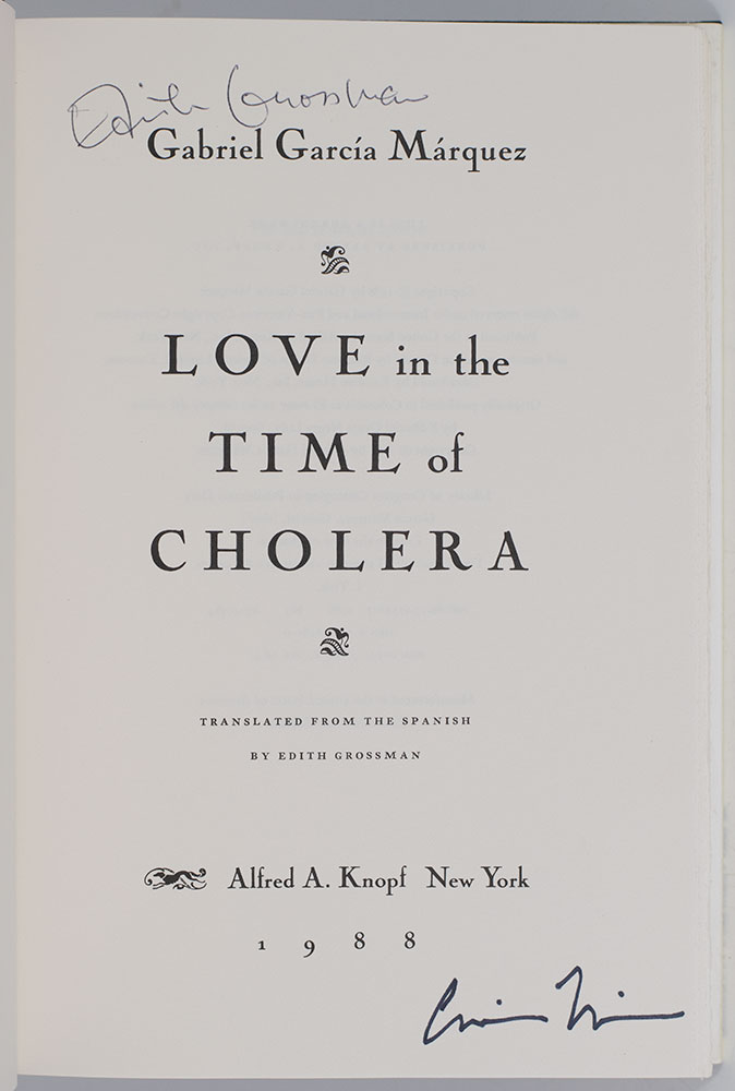 First American edition of the author's work, which ranks as one of the great novels of the last half of the twentieth century. Octavo, original half cloth. Boldly signed by translator Edith Grossman on the title page. Additionally signed three times by jacket designer Chip Kidd, on the front panel, on the title page and rear jacket flap. Fine in a fine dust jacket. Jacket design by Carol Devine Carson and Chip Kidd. Translated from the Spanish by Edith Grossman.