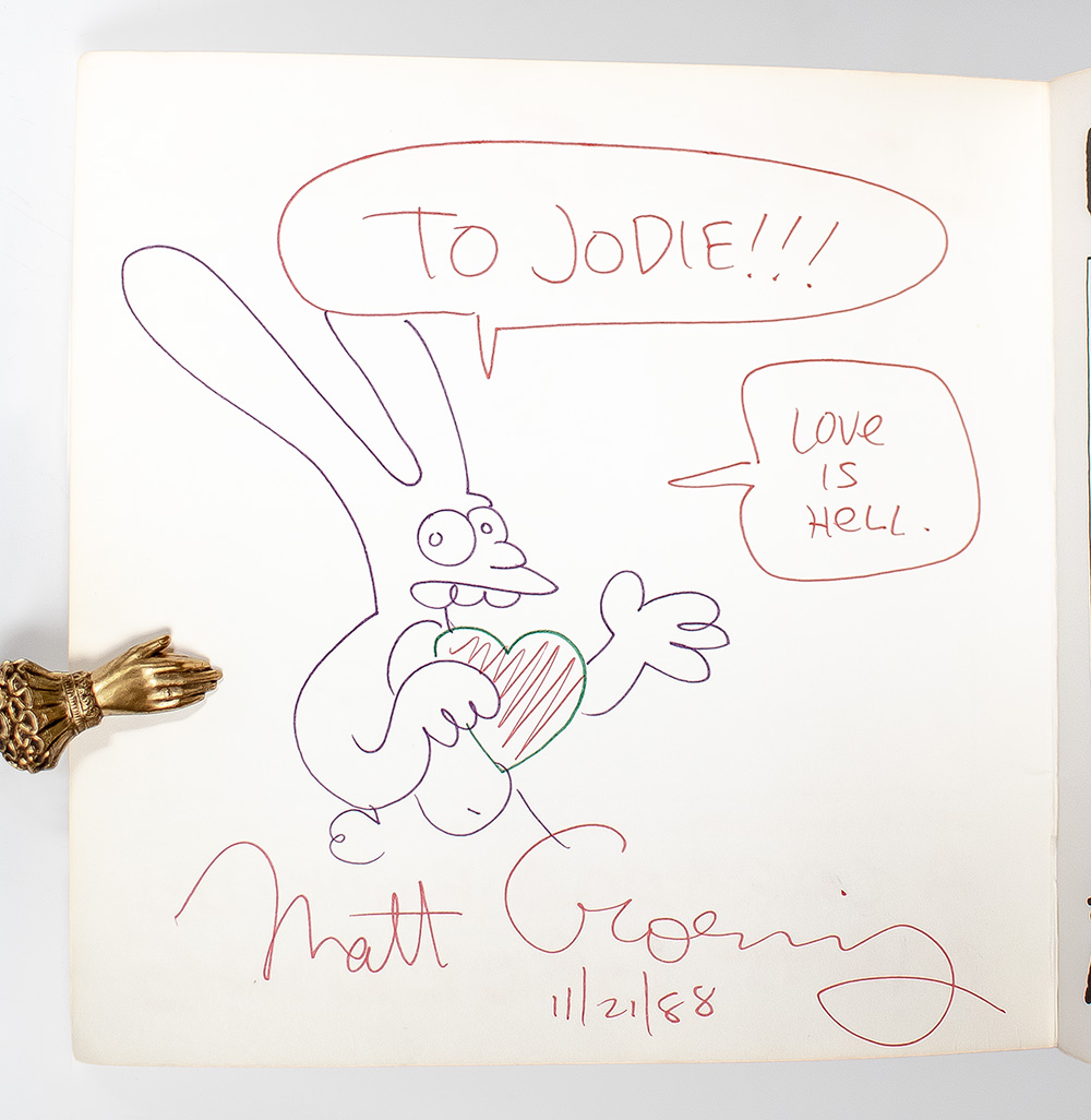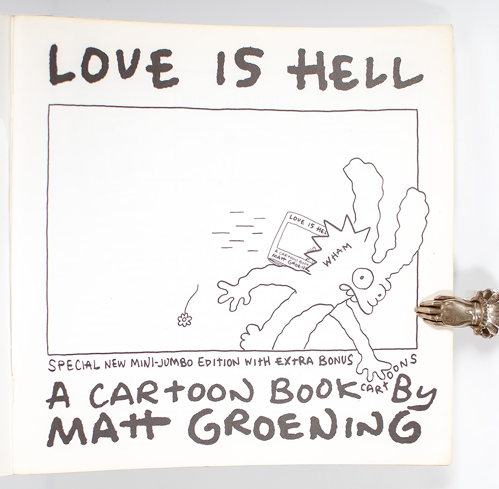 Special New Mini-Jumbo edition of this comical cartoon book that were the source material for The Simpsons by the creator of 'The Simpsons' and 'Futurama.' Oblong quarto, original illustrated wrappers. Boldly signed by the author on the front pastedown, "Matt Groening, 11/21/88," below a full-length sketch of his character Binky holding a heart with two speech bubbles inscribed in red ink: "To Jodie!!! Love is Hell." In near fine condition. This early sketch of Binky was drawn about a year before 'The Simpsons' made their Fox network debut on December 17, 1989.