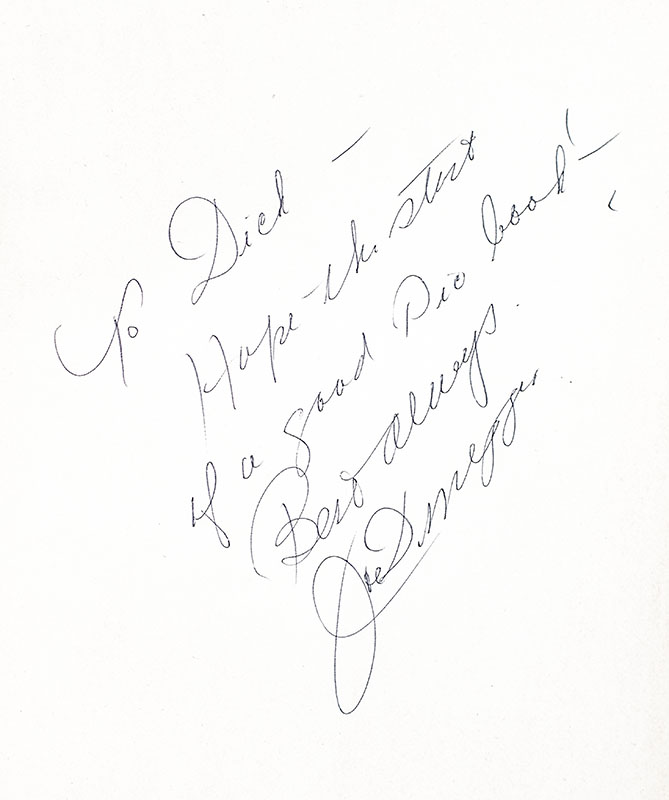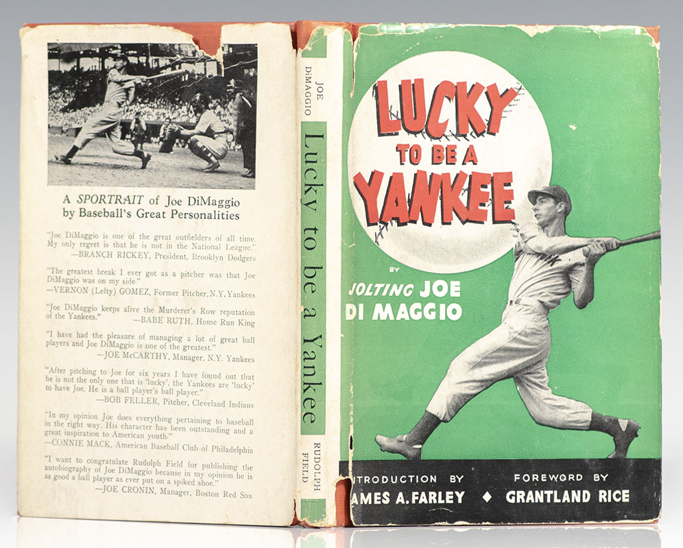 First edition of this early autobiography by Joltin Joe Di Maggio. Octavo, original cloth, illustrated. Presentation copy, inscribed by the author in a contemporary hand, "To Dick- Hope the start of a good Pic Book! Best alwasy Joe Di Maggio." Foreword by Grantland Rice. Introduction by James A. Farley. Near fine in a very good price-clipped dust jacket. Most desirable signed by this baseball legend.