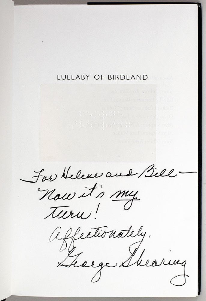 First edition of George Shearing's Lullaby of Birdland; inscribed by him to American journalist William Safire