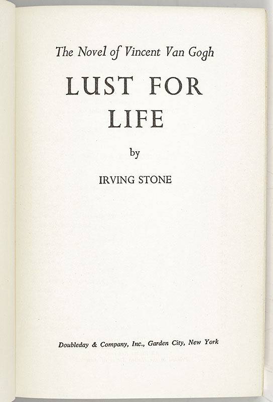 First Doubleday edition of this classic, bestselling biographical novel of Vincent Van Gogh. Octavo, original cloth. Signed by Irving Stone and by actor Kirk Douglas, who starred as Van Gogh in the 1956 film. Fine in a near fine dust jacket.