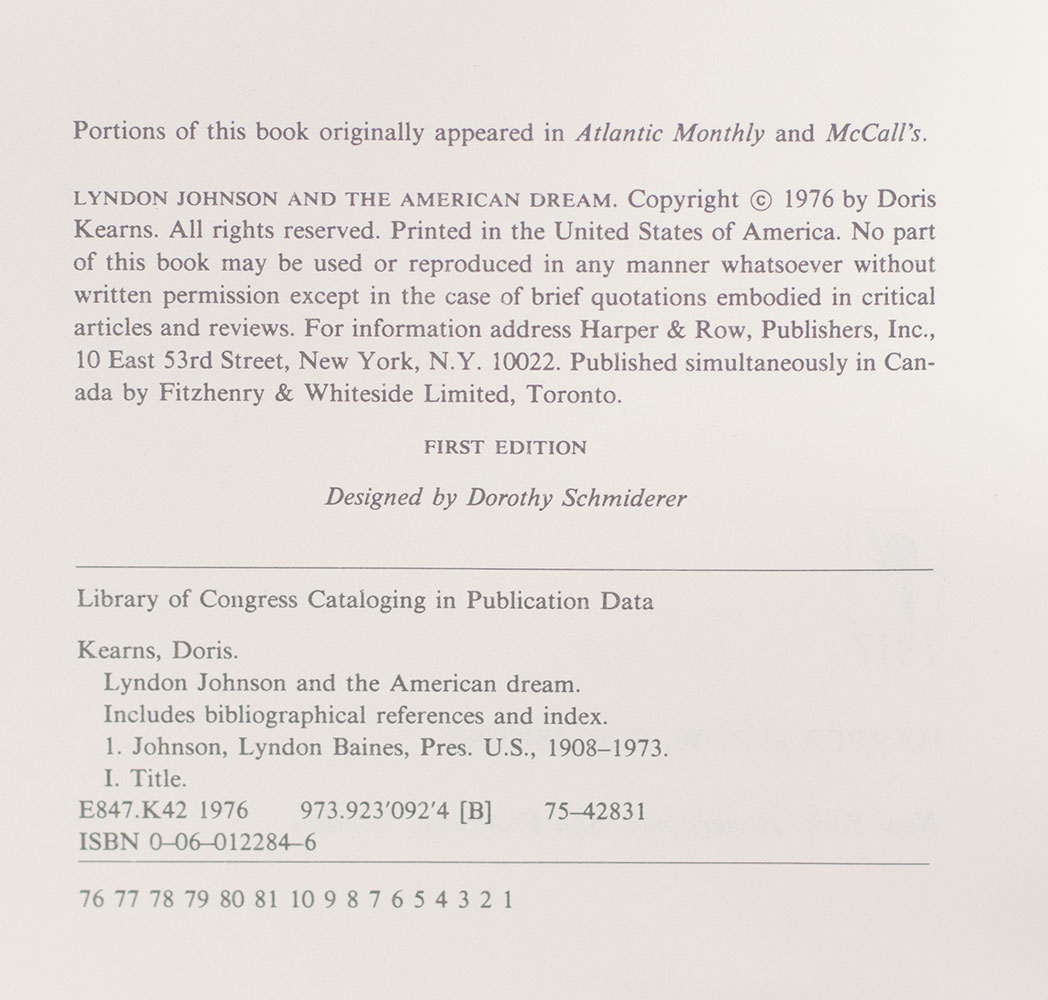 First edition of the Pulitzer Prize-winning historian’s first book. Octavo, original cloth. Presentation copy, warmly inscribed by the author in a contemporary hand on the front free endpaper, "To Jane Engelhard, With all my best wishes to the mother of a lovely girl, Doris Kearns." Fine in a near fine price-clipped dust jacket. Jacket design by Paul Bacon. Housed in a custom half morocco chemise and clamshell box.