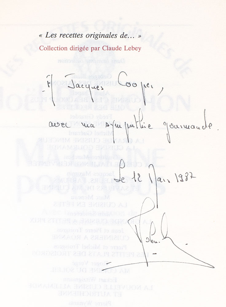 First edition of Robuchon's classic cook book. Octavo, original pictorial boards, pictorial endpapers, illustrated with full-page color photographs by Corrinne Ryman and Pierre Cabannes. Presentation copy, inscribed by the chef/author on the half-title page, "A Jacques Cooper, avec ma sympathie gourmaude Le 13 Mars 1986 Robuchon." In very good condition with a small area of dampstaining to the first several pages. Cover design by George Lemoine. Books signed by Robuchon are rare.
