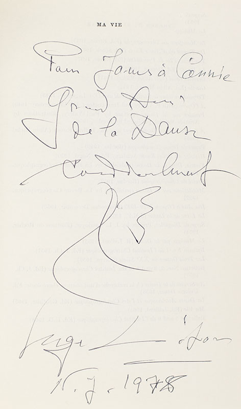 First edition of Serge Lifar's intimate, revealing autobiography. Octavo, original cloth, illustrated. Presentation copy, inscribed by the author on the half-title page. Near fine in a near fine dust jacket.