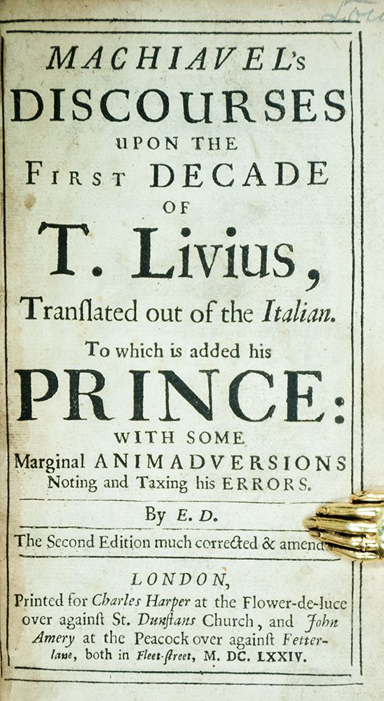 "Offer here to your graces my best endeavors, discovering at large their imperfections": Finely bound edition of edward dacres' historic translation of machiavelli's discourses
