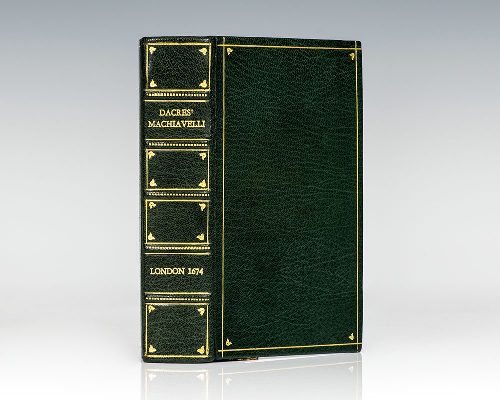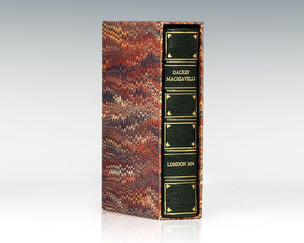 Finely bound second edition of Edward Dacres' historic translation of the works of Niccolo Machiavelli, including The Prince. Octavo, bound in full green morocco, gilt tiles and tooling to the spine, raised bands, marbled endpapers. In very good condition, housed in a custom marbled slipcase. Rare.
