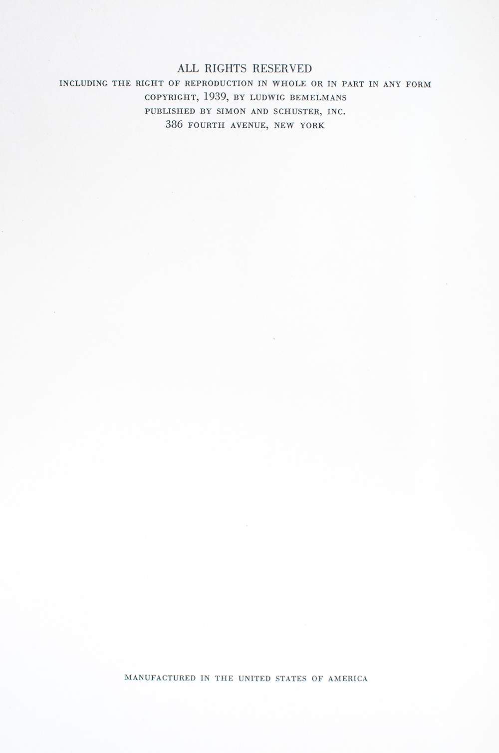First edition, first issue of this classic children's book with the 1939 date on the title page and with 12 girls instead of 11 in the "They went home and broke their bread" illustration. Thin folio, original illustrated boards, color illustrations throughout, illustrated endpapers. Association copy, inscribed by the author on the front free endpaper, "For Elinor Green Ludwig Bemelmans." The recipient, Elinor Green, was the promotions director at Simon and Schuster in the 1940s, and married Merle Miller in 1948. Near fine in a very good dust jacket. Light rubbing to the extremities and spine of the dust jacket, closed tear to the bottom edge of the front panel of the dust jacket. A nice association, first editions signed and inscribed are rare.