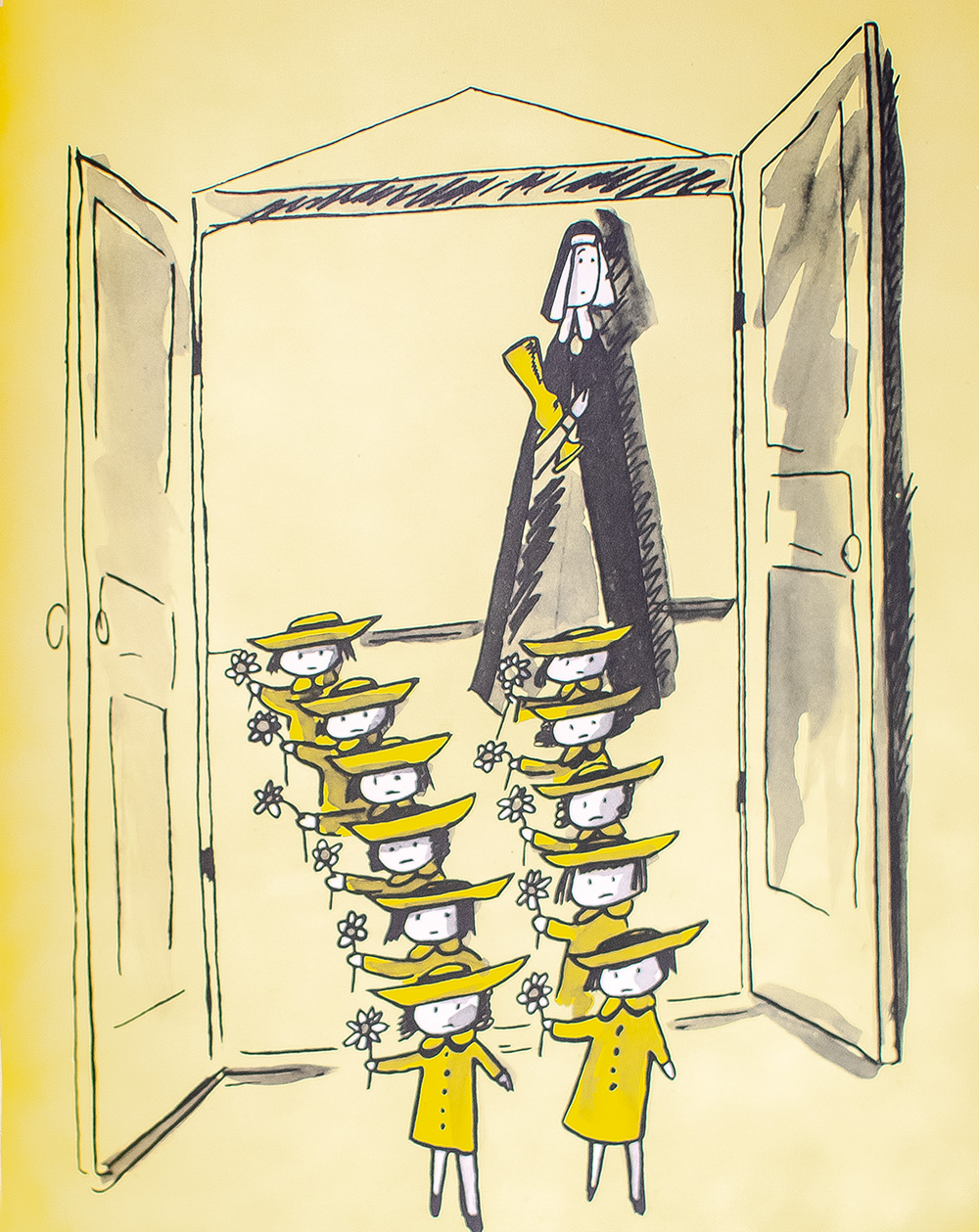 First published in 1939, each Madeline story begins: "In an old house in Paris, that was covered with vines, lived twelve little girls in two straight lines... the smallest one was Madeline." “The original inspiration for Madeline was the convent where Bemelmans’ mother was educated as a child, along with the author’s own experience in boarding school, where he walked with his classmates in two straight lines” (Silvey, 55).
