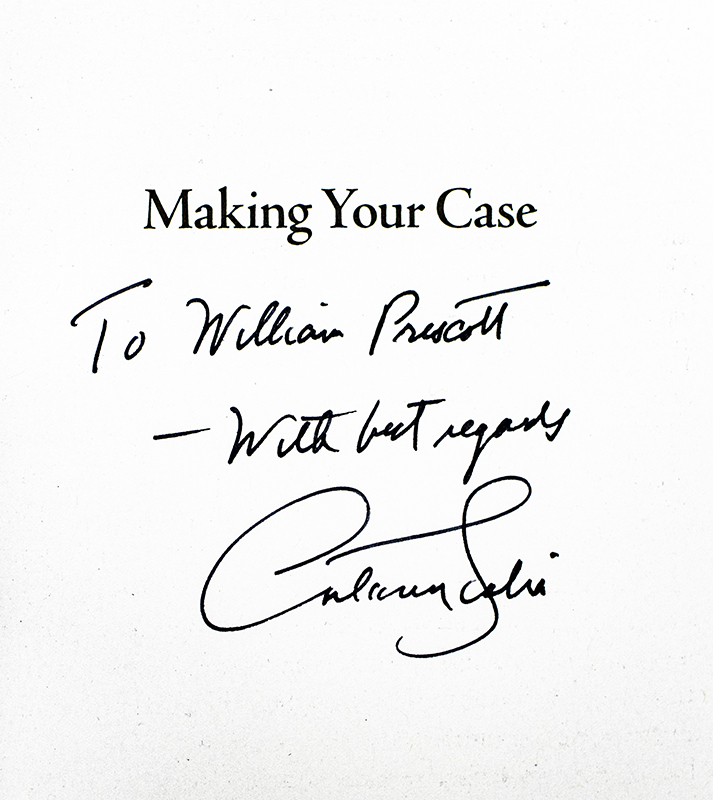 Early printing of Scalia's work on effective legal persuasion. Octavo, original cloth. Presentation copy, inscribed by Justice Scalia on the half-title page, "To Donald Ely With best regards Antonin Scalia." Fine in a fine dust jacket.