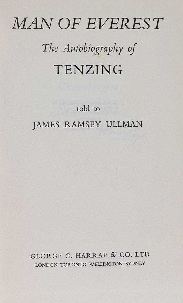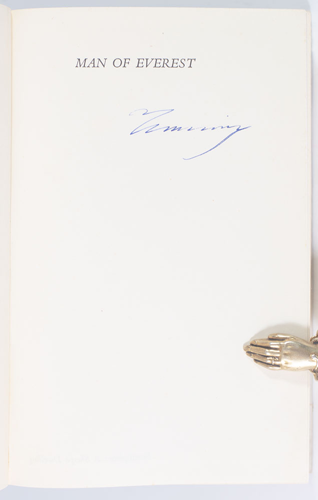 First edition, early printing of Norgay's autobiography. Octavo, original cloth, illustrated with photographic frontispiece and 18 pages of photographs. Boldly signed by Tenzing Norgay on the front free endpaper. Near fine in a very good dust jacket with two small chips. Written with James Ramsey Ullman. Books signed by Norgay are rare.