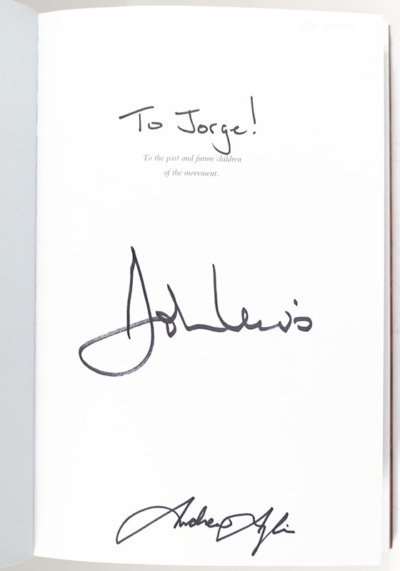 First edition, first printing of the first book in John Lewis and Andrew Aydin’s March trilogy and winner of the Coretta Scott King Award. Octavo, original illustrated wrappers, illustrated. Inscribed by John Lewis on the half-title page, "To Jorge, John Lewis" and signed by Andrew Aydin. In fine condition. Designed by Chris Ross and Nate Powell. With the Coretta Scott King Award seal to the front panel.