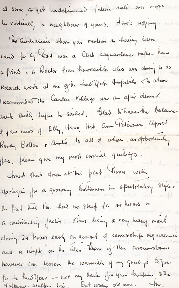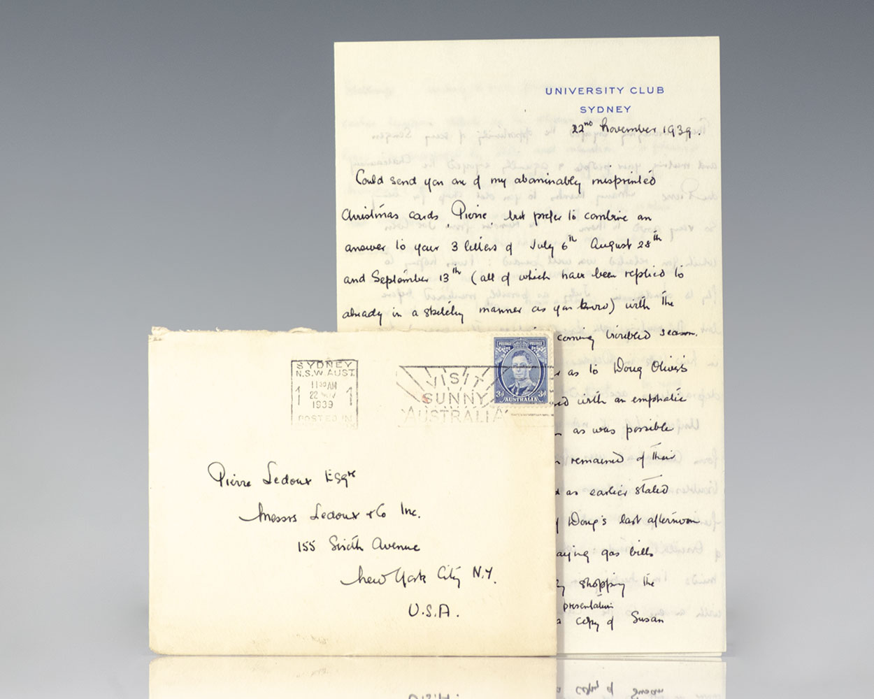 Extensive archive of autograph letters, typed bulletins, and extensive notes of advice sent by Margaret Mead to her protégée, anthropologist Louis-Pierre Ledoux. The archive includes: thirty-nine pages of typed notes of advice from Mead to Ledoux on doing anthropological research among the Murik people of the Sepik River region of New Guinea [includes her advice on developing the philosophy and agenda of the study and notes on getting curios out of the country. Ledoux was the second American visitor to the Murik people and first formally trained as an anthropologist to visit them. Mead had spent time in the region from 1927-33. Ledoux graduated Harvard in 1935 and spent at least six months thereafter in New Guinea making extensive notes and anthropological observations which resulted in a book-length manuscript that Ledoux never published, although he provided Mead a copy of the manuscript, which she extensively reviewed and annotated. Also included are Mead's typed "Murik Notes" based on interviews with two adolescents who were visiting near Karawop in 1932 and a floor plan of how Ledoux should set up his living quarters]; an autograph letter signed by Mead to Ledoux dated November 22, 1939 with the original transmittal envelope in which Meade recounts how their mutual friends the Olivers visited her and that she liked them immensely, "Part of Doug's last afternoon in Sydney was spent with me paying gas bills, depositing parcels and sporadically shopping, the latter expedition culminating in a presentation copy of Susan Stebbing's "Thinking To Some Purpose," fruit of an earlier luncheon debate on the relative merits of logic (as envisaged by D.O.) and intuition -- or plainer hunches (as experienced by M.S.)." After graduating from Harvard in 1935, Louis-Pierre Ledoux did fieldwork in the Sepik River region of New Guinea, where he did extensive research on the Murik people with the Mead's diligent guidance. The two had mutual friends in Douglas Oliver and his wife Eleanor, who were in Bougainville in the Solomon Islands and had both graduated from Harvard at the same time as Ledoux. Oliver went on to publish several books on the anthropology of the Solomon Islands and other Pacific locales; and three typewritten bulletins from May, June and August 1938 from Tambunum Village, Sepik River, New Guinea, sent to Ledoux by Mead's mother and accompanied by a friendly handwritten letter from her. Part of a larger series of Bulletins, Meade composed these regular updates to send to friends and family documenting her work with British anthropologist Gregory Bateson, their research methods and how they spent their time. Mead's third and longest-lasting marriage (1936–1950) was to the British anthropologist Gregory Bateson with whom she had a daughter, Mary Catherine Bateson, who would also become an anthropologist. This last bulletin is accompanied by a typed note from Mead's mother dated September 30, 1939, "My daughter Margaret in a recent letter asked me to send you some Bulletins..." In near fine condition. Exceedingly rare. A fine association collection with the Mead's personal Bulletins of particular scarcity.