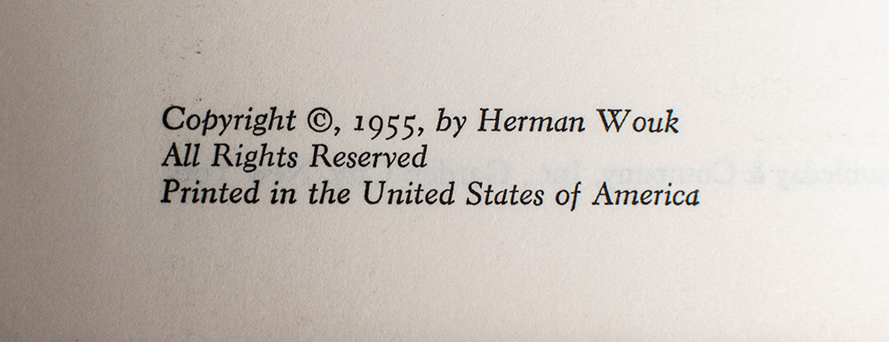 First edition, early printing of the author's classic work. Octavo, original half cloth. Boldly signed by Herman Wouk on the title page. Near fine in a very good price-clipped dust jacket. Jacket design by John Scotford.
