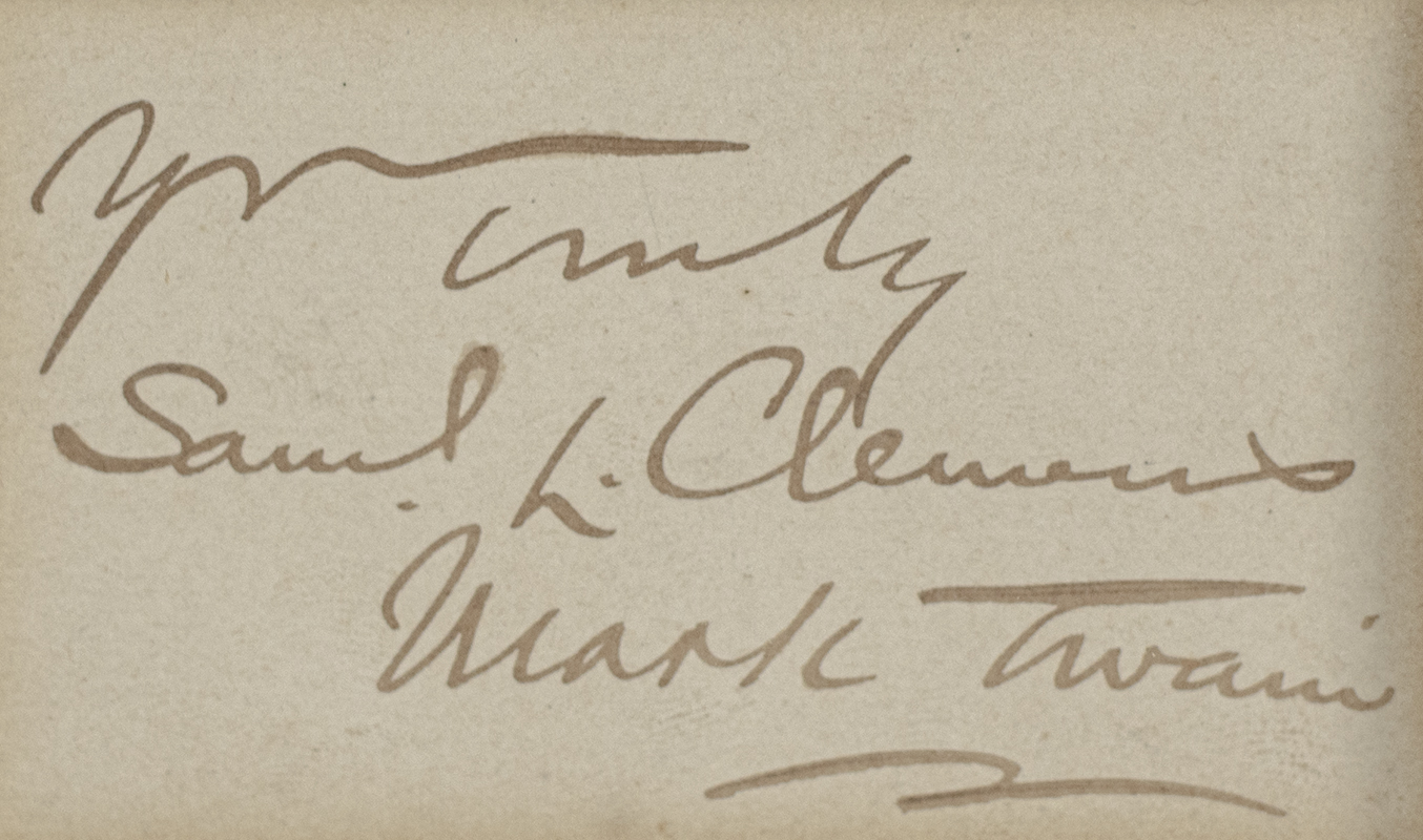 Original photograph of Mark Twain by A. F. Bradley, signed with a note, "Yrs truly Samuel L. Clemens Mark Twain", framed beneath original photograph. The silver gelatin print is a seated portrait of Twain, stamped "Pach Bros. NY" lower right. Double matted and framed. The entire piece measures