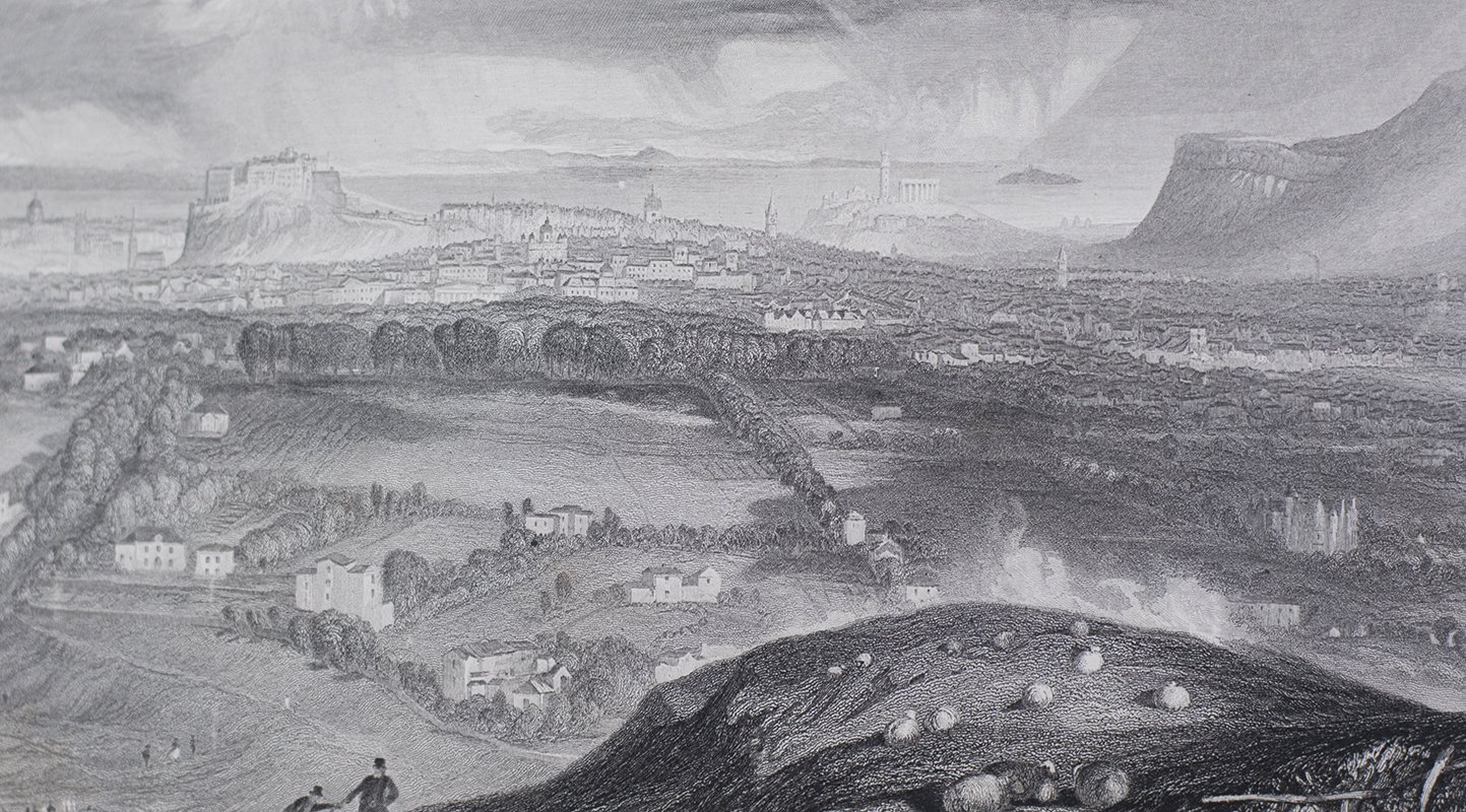 The first known example of a disappearing fore-edge painting (where the painting is not visible when the book is closed) dates back to 1649. In the mid 18th century, the subject matter of fore-edge paintings evolved from simply decorative or heraldic designs to landscapes, portraits and religious scenes, usually painted in full color. The technique was popularized by John Brindley (1732-1756), publisher and bookbinder to the Prince of Wales and Edwards of Halifax, a distinguished family of bookbinders and booksellers. The majority of extant examples of fore-edge paintings date to the late 19th and early 20th century on reproductions of books originally published in the early 19th century, including the present volume.