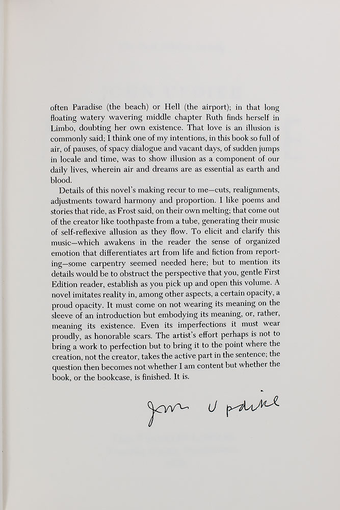 First edition of "the gentlest book Updike has written" (Kirkus Reviews), privately printed exclusively for Members of the First Edition Society. Octavo, original publisher's full leather elaborately stamped in gilt, moire silk endpapers, all edges gilt, silk ribbon bound in. Presentation copy, inscribed by the author on the limitation page, "For Erica + Ken warm regards, John." The recipients, American writer Erica Jong and lawyer Kenneth David Burrows were married in August of 1989. Erica Jong remains best known for her 1973 novel Fear of Flying which became famously controversial for its portrayal of female sexuality and figured prominently in the development of second-wave feminism. Written in the first person and narrated by its protagonist, 29-year-old American poet Isadora Wing, Fear of Flying was written in the throes of the Sexual Revolution of the 1970s and encapsulated the movement’s redefinition of female sexuality. In interviews, Jong stated: “At the time I wrote Fear of Flying, there was not a book that said women are romantic, women are intellectual, women are sexual—and brought all those things together… What [Isadora is] looking for is how to be a whole human being, a body and a mind, and that is what women were newly aware they needed in 1973.” The novel remains a feminist classic and has sold more than 20 million copies worldwide. In fine condition.