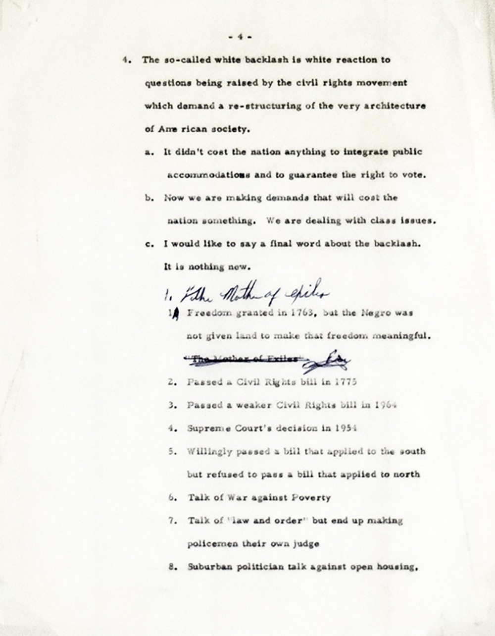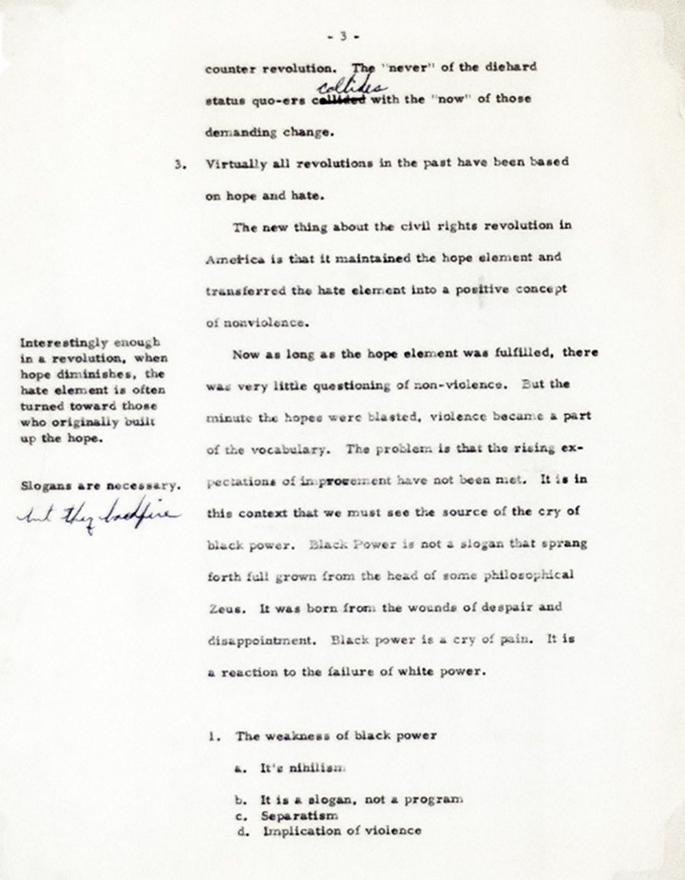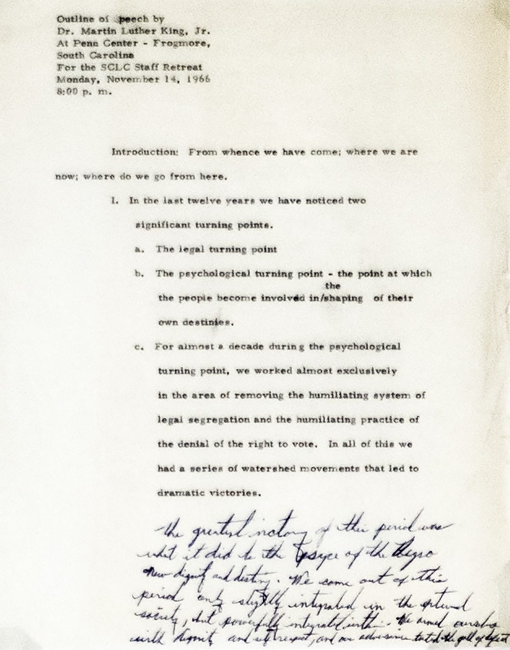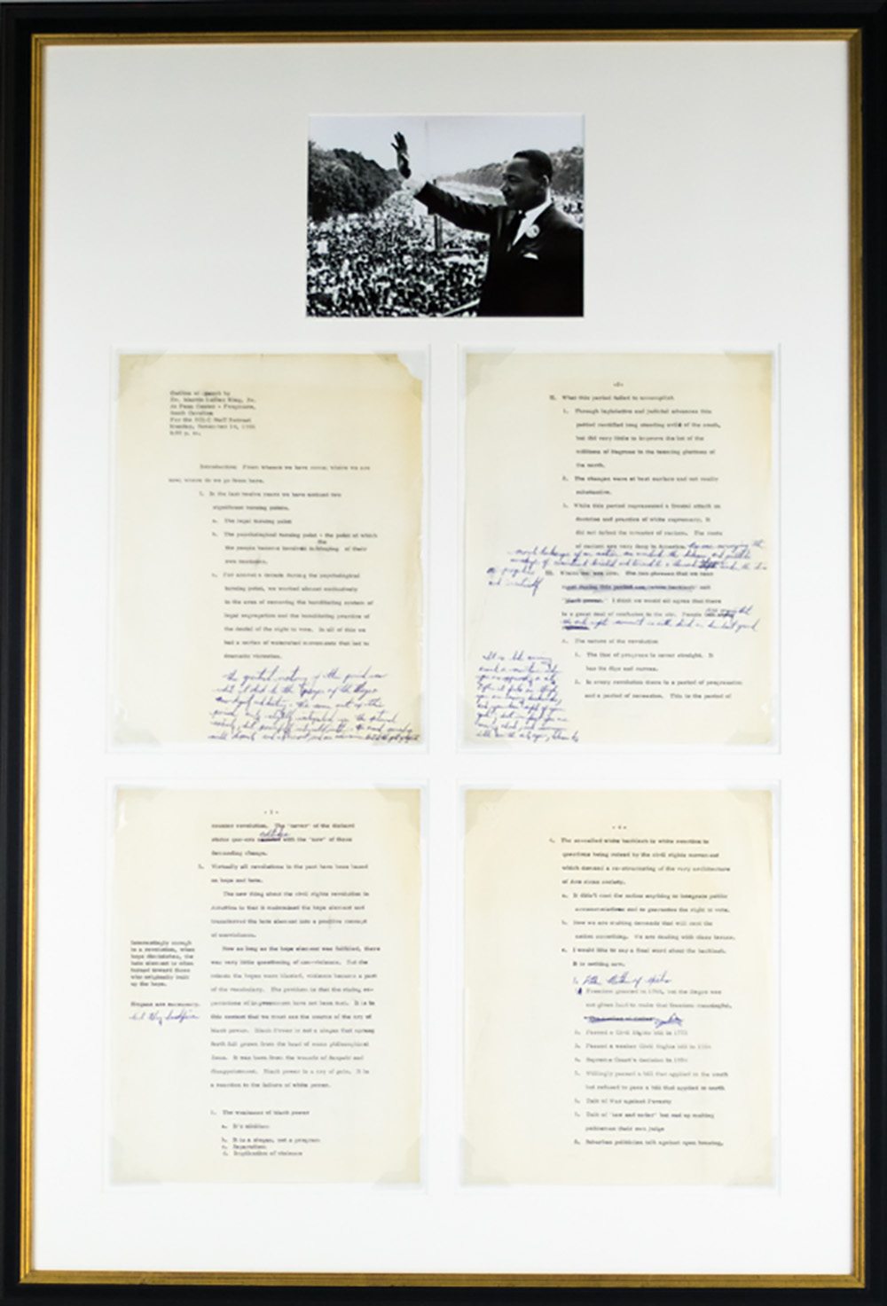 Draft typescript, four pages with extensive handwritten additions and edits all in Martin Luther King's hand. This is the outline for a speech delivered to the Southern Christian Leadership Conference’s staff retreat, Frogmore, South Carolina, November 14, 1966. An exceptionally rare annotated King manuscript, with fascinating insights about the history of the Civil Rights campaign and King’s thoughts about the challenges from the Black Power movement (“It’s a slogan not a program'') and the growing white backlash (“It is nothing new''). King begins, “Introduction: From whence we have come; where we are now; where do we go from here.'' King describes the legal and psychological turning points as well as the dramatic progress Negroes had made in segregation and voting rights. Surveying the 14 years from the Montgomery Bus Boycott to the present, King writes in blue ballpoint: “The greatest victory of this period was what it did to the psyc[h]e of the Negro. New dignity and destiny. We came out of this period only slightly integrated in the external society, but powerfully integrated within. We armed ourselves with dignity and self-respect, and our adversaries tasted the gall of defeat.'' King notes that the victories in the South did nothing “to improve the lot of the millions of Negroes in the teeming ghettoes of the North." The movement dented the idea of white supremacy but “did not defeat the monster of racism.'' In another striking handwritten addition King states, “No one surveying the moral landscape of a nation can overlook the hideous and pathetic wreckage of commitment twisted and turned to a thousand shapes under the stress of prejudice and irrationality.” King crosses out a line dealing with the cause and effect from the Civil Rights “Black Power” movement and the “white backlash” caused by it, but adds that people “are saying that the civil rights movement is either died [sic] or has lost ground.” King points out, in the left margin with powerful visual imagery, that the cause of racial equality—or any great social revolution—“is like curving around a mountain when you are approaching a city. Often it feels as though you are moving backwards, and you lose sight of your goal; but in fact you are moving ahead, and soon you will see the city again, closer by.'' One can’t read that without thinking of King’s haunting final speech delivered at Bishop Charles Mason Temple, Memphis, Tenn., April 3, 1968: ‘I’ve been to the mountaintop…And he’s allowed me to go up to the mountain. And I’ve looked over. And I’ve seen the Promised Land.’ In remarkable fashion, this speech seems to establish King’s structure for the rest of his work in the Civil Rights movement, as the question first posed in this speech “Where Do We Go From Here?” was the title for a keynote speech King delivered on Aug. 16, 1967, at the Eleventh Annual Convention of The Southern Christian Leadership Conference in Atlanta, Georgia, and was further published in a book King published that same year, Where Do We Go From Here: Chaos or Community? expanding upon the final segment of the “whence we have come; where we are now; where do we go from here” framework introduced in this outline. Small paper loss at one corner (not affecting text). Matted and framed.