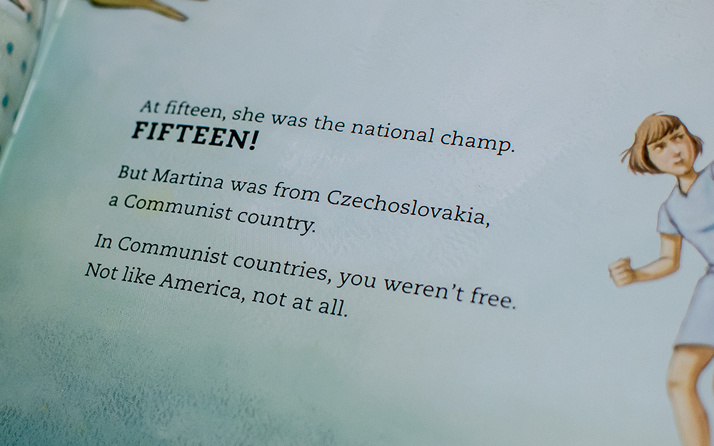 Martina Navratilova and Chris Evert come from completely different places and play tennis in completely different ways. Chrissie is the all-American girl: practiced, poised, with perfect technique. Martina hails from Czechoslovakia, a Communist country, and her game is ruled by emotion. Everything about them is different, except one thing: they both want to be the best. But as their intense rivalry grows, something else begins to swing into place, and a friendship forms that will outlast all their tennis victories. Phil Bildner and Brett Helquist tell the engaging true story of these two masters of the court as they win title after title — and, most importantly, the hearts of the fans.