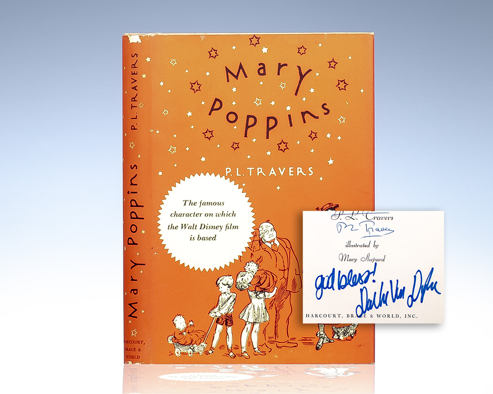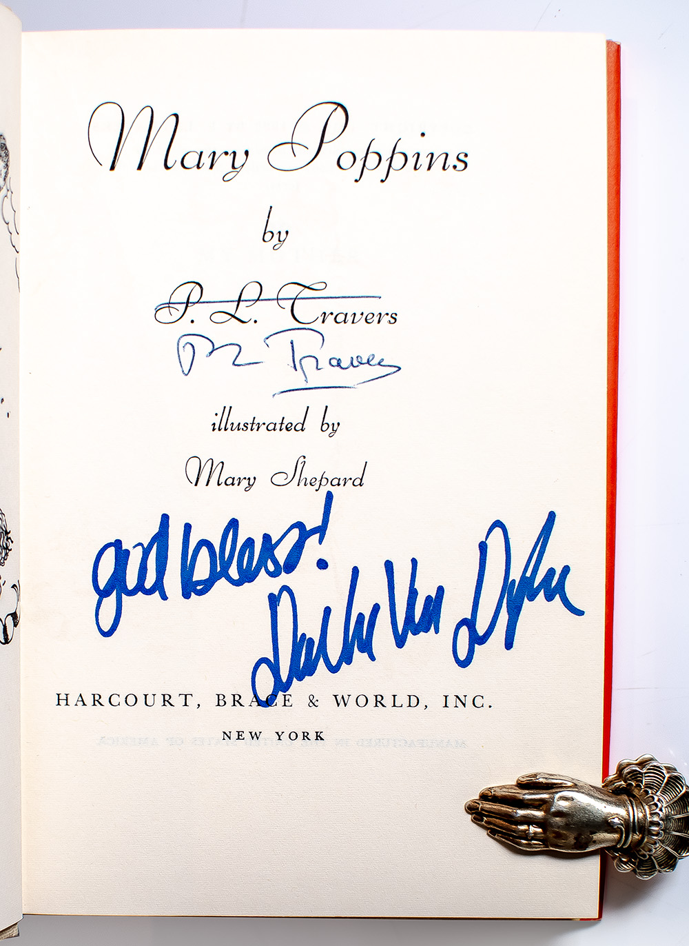 Later printing of this children's classic. Octavo, original cloth, illustrated by Mary Shepard. Boldly signed by P.L. Travers on the title page and additionally by actor Dick Van Dyke, who starred in the 1964 film adaptation. Fine in a near fine dust jacket. Rare and desirable signed by both Travers and Van Dyke.
