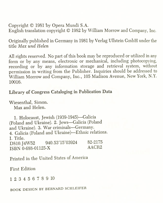 First Edition of Max and Helen: A Remarkable True Love Story; Inscribed by Simon Wiesenthal