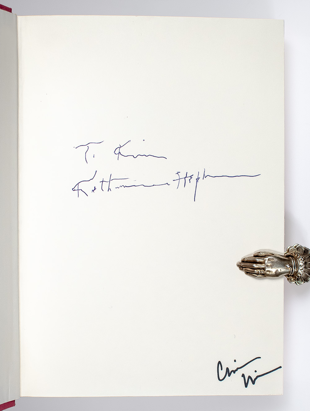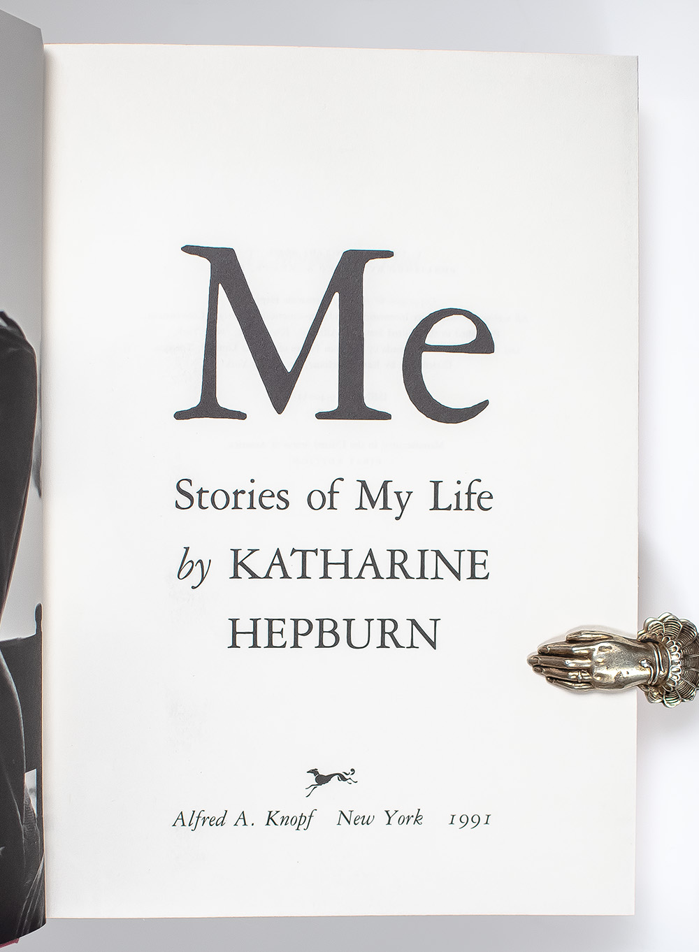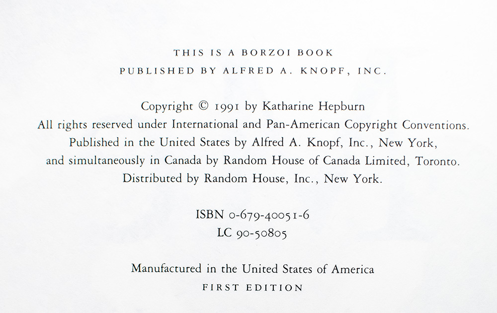 First edition of Katharine Hepburn's revealing autobiography. Octavo, original cloth, illustrated with 165 photographs. Boldly signed by Katharine Hepburn on the front free endpaper. Additionally signed three times by legendary jacket designer Chip Kidd; on the front panel, on the front free endpaper and on the rear jacket flap. Fine in a fine dust jacket. Jacket design by Carol Devine Carson and Chip Kidd.