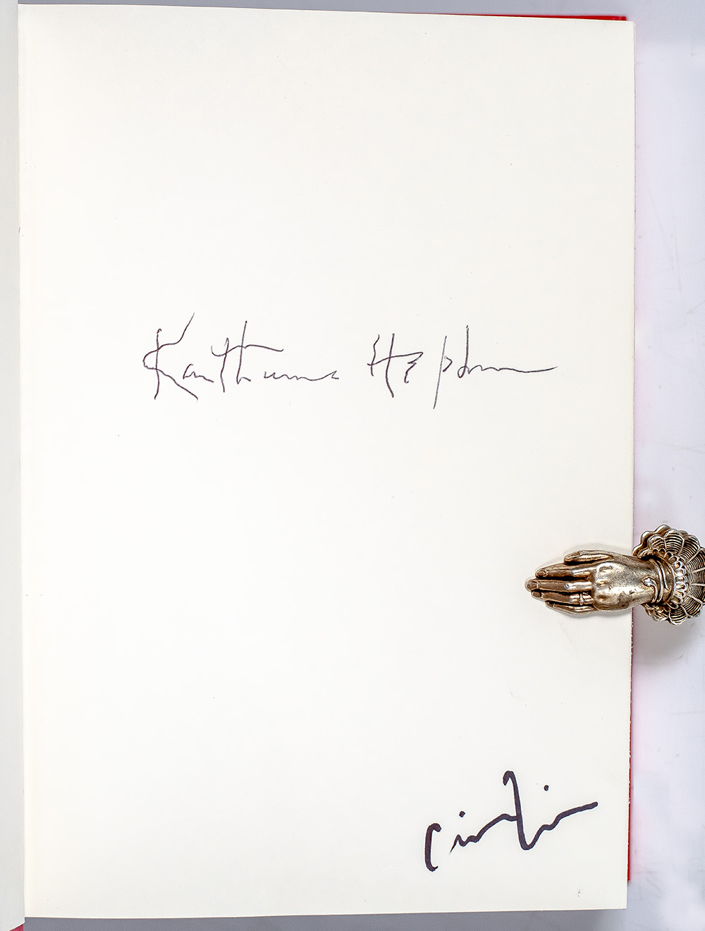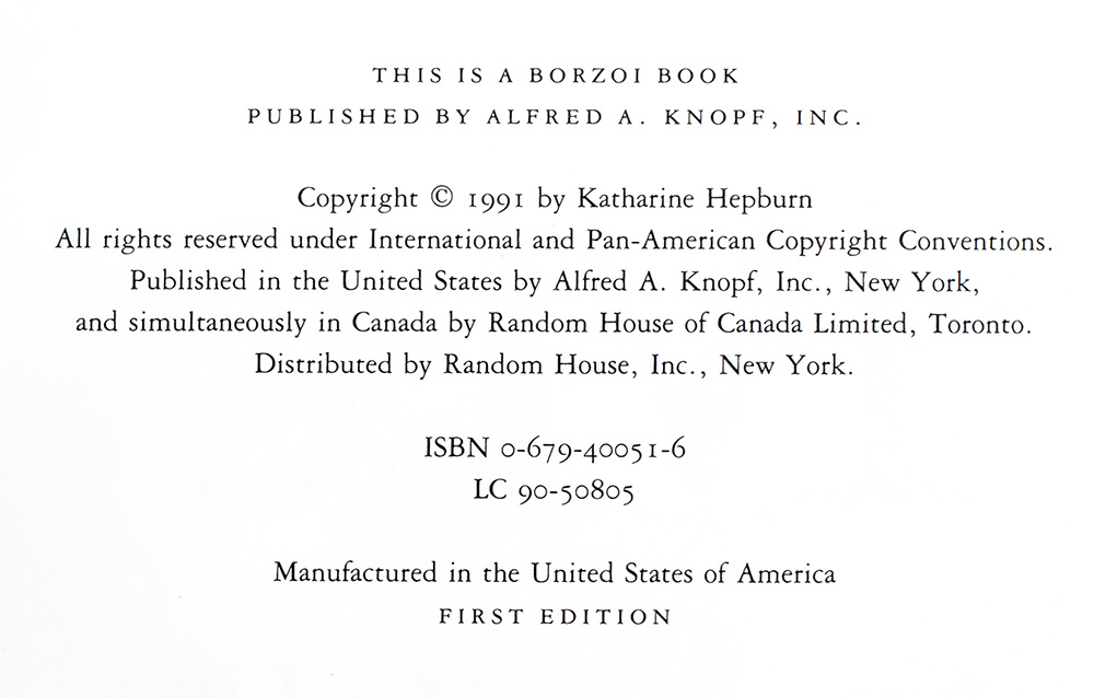 First edition of Katharine Hepburn's revealing autobiography. Octavo, original cloth, illustrated with 165 photographs. Signed by Katharine Hepburn on the front free endpaper. Additionally signed three times by legendary jacket designer Chip Kidd; on the front panel, on the front free endpaper and on the rear jacket flap. Fine in a fine dust jacket. Jacket design by Carol Devine Carson and Chip Kidd.