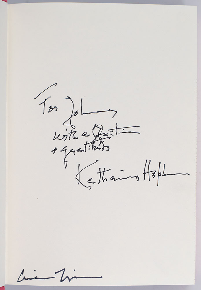 First edition of Katharine Hepburn's revealing autobiography. Octavo, original cloth, illustrated with 165 photographs. Association copy, inscribed by the author on the front free endpaper to Johnny Carson, "For Johnny with affection and gratitude Katharine Hepburn." Johnny Carson was an television host, comedian, writer, and producer. He is best known as the host of The Tonight Show Starring Johnny Carson. Carson received six Primetime Emmy Awards, the Television Academy's 1980 Governor's Award, and a 1985 Peabody Award. He was inducted into the Television Academy Hall of Fame in 1987. Carson was awarded the Presidential Medal of Freedom in 1992 and received a Kennedy Center Honor in 1993. Additionally signed three times by jacket illustrator Chip Kidd; on the front panel, on the front free endpaper and on the rear jacket flap. Fine in a fine dust jacket. Jacket design by Carol Devine Carson and Chip Kidd. An exceptional association.