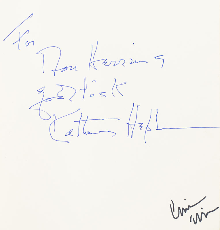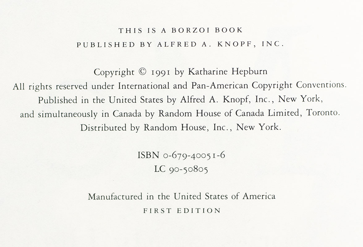 First edition of Katharine Hepburn's revealing autobiography. Octavo, original cloth, illustrated with 165 photographs. Presentation copy, inscribed by the author on the front free endpaper, "For Ron Herring good luck Katharine Hepburn." Additionally signed three times by jacket illustrator Chip Kidd, once on the front panel, on the front free endpaper and on the rear flap. Fine in a fine dust jacket. Jacket design by Carol Devine Carson and Chip Kidd.