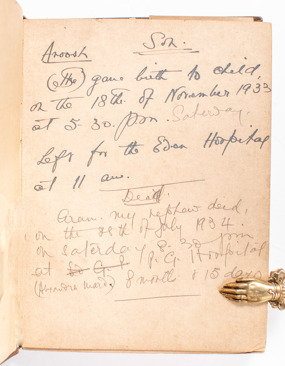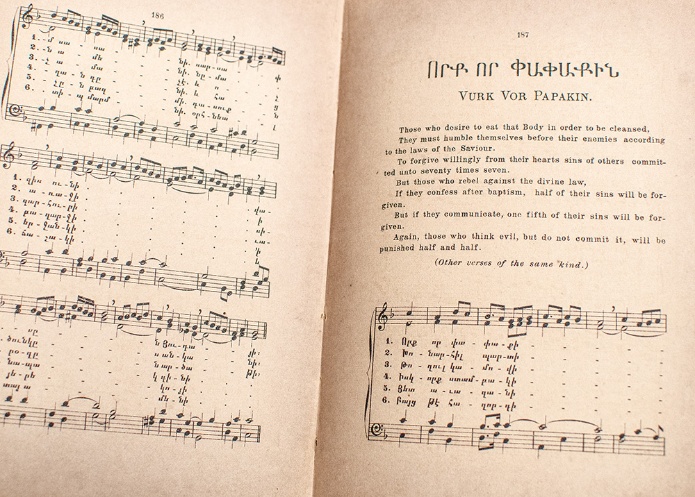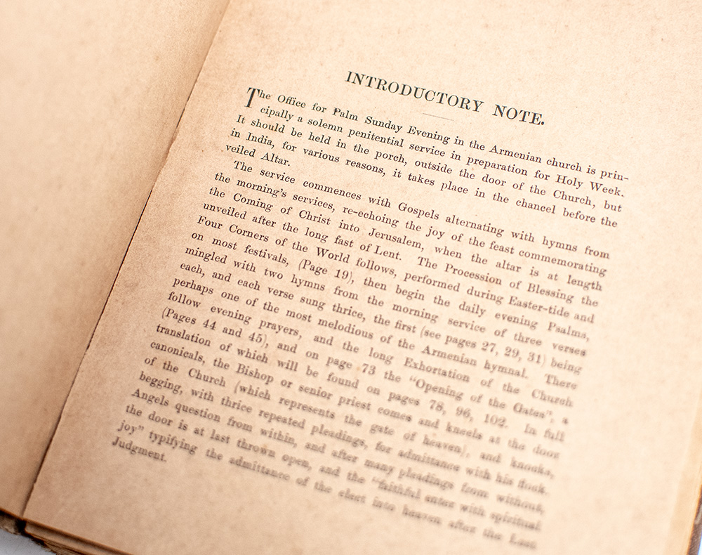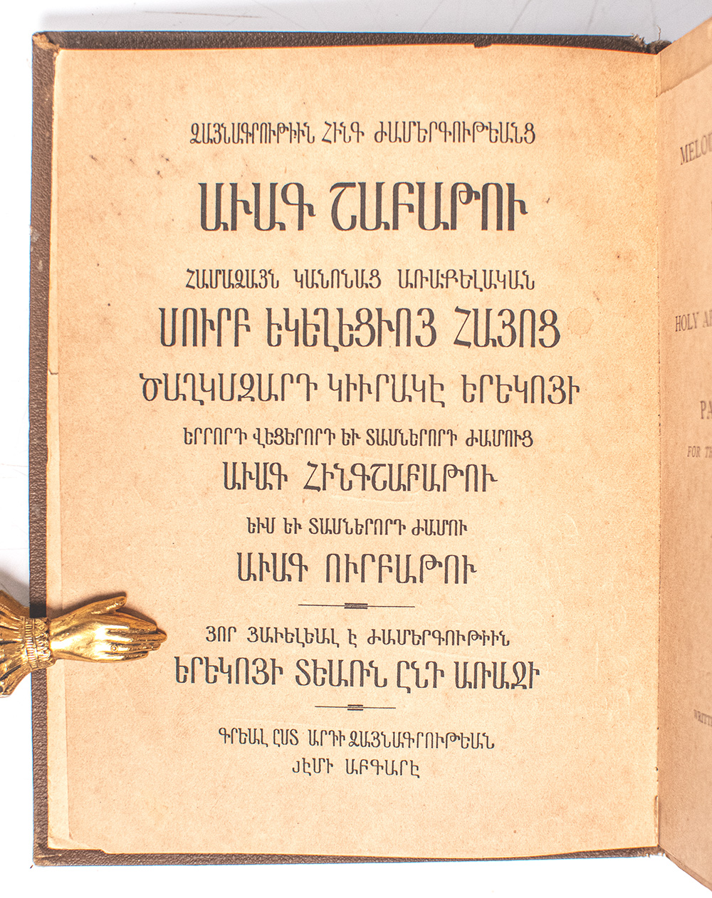 Early edition of this rendering of sacred melodies into modern musical notation. Octavo, written in English and Armenian, bound in full brown cloth with gilt titles to the spine, gilt cross vignette to the front panel, musical stanzas throughout. Written down in modern musical notation by Amy Apcar. In good condition with rubbing and losses to the spine.