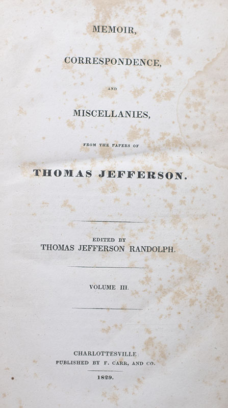 Memoir, Correspondence, and Miscellanies, from the Papers of Thomas Jefferson. Edited by Thomas Jefferson Randolph.