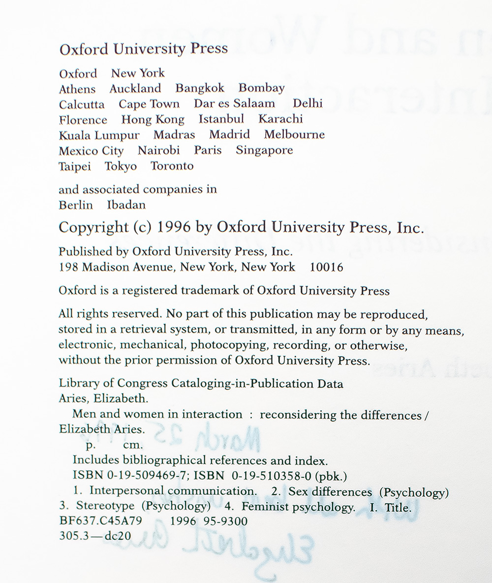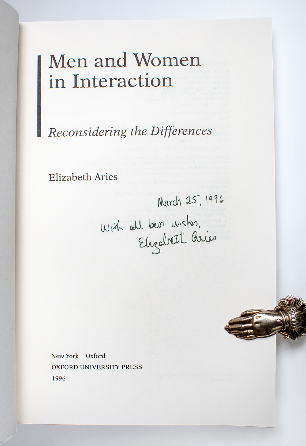 First Edition of Men and Women in Interaction: Reconsidering the Differences; from the library of Justice Ruth Bader Ginsburg; Signed by Elizabeth Aries