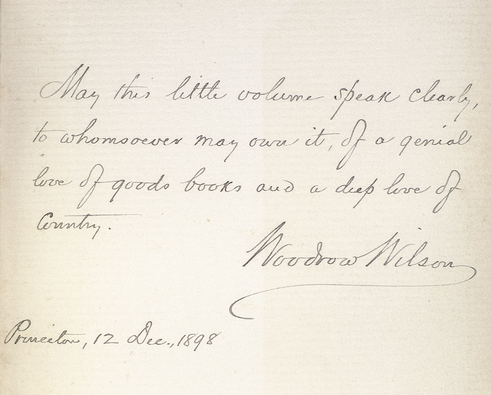 First edition of this collection of essays by the future president of the United States. Octavo, original cloth. Signed by the author on the front free endpaper with a lengthy inscription, "May this little volume speak clearly, to whomsoever may own it, of a genial love of good books and a deep love of country. Woodrow Wilson Princeton, 12 Dec., 1898." In near fine condition. Housed in a custom clamshell box. An exceptional inscription.