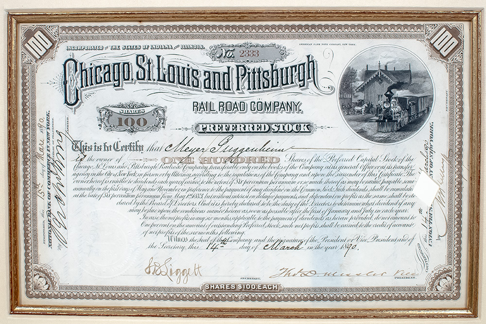 Meyer Guggenheim, the patriarch of the Guggenheim family, made his fortune in mining and smelting in the mid- to late-19th century. In 1901 the family merged their mining interests with the American Smelting and Refining Company, a trust composed of the country’s largest metal-processing plants, and dominated the industry for the next three decades, laying the foundation for the U.S. mining industry that exists today. With this stock certificate, Guggenheim invested in the Chicago, St. Louis and Pittsburgh Rail Road Co., a merger of the Columbus, Chicago and Indiana Central RR and the Pittsburgh, Cincinnati and St. Louis RR, which would later evolve once more into the Pittsburgh, Cincinnati, Chicago and St. Louis RR.