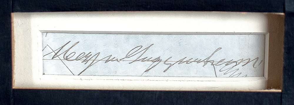 Rare Chicago, St. Louis and Pittsburgh Railroad Company stock certificate signed by American industrialist and philanthropist Meyer Guggenheim. Oblong octavo, one page partially printed and accomplished in manuscript, the certification is dated March 14, 1890 and grants Guggenheim 100 shares in the Chicago, St. Louis and Pittsburgh Railroad Company. Signed by him on the verso, "Meyer Guggenheim." Additionally signed by Thoms D. Messler as Vice President of the Company. In near fine condition. Matted and framed with a portrait of Guggenheim and an informational placard. The piece measures 18.5 inches by 27.25 inches. Rare and desirable.