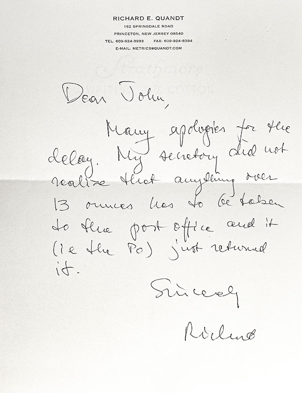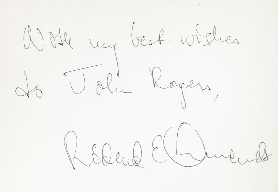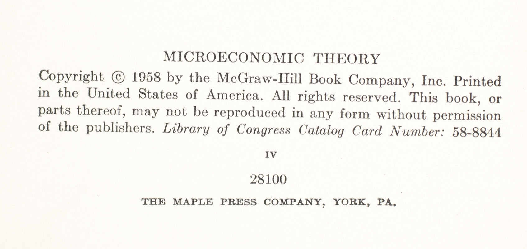First edition of this classic work in microeconomic theory. Octavo, original cloth. Presentation copy, inscribed by Quandt on the front free endpaper, "With my best wishes to John Roger Richard E. Quandt." Also laid in is a autograph signed letter from the economist. In very good condition.