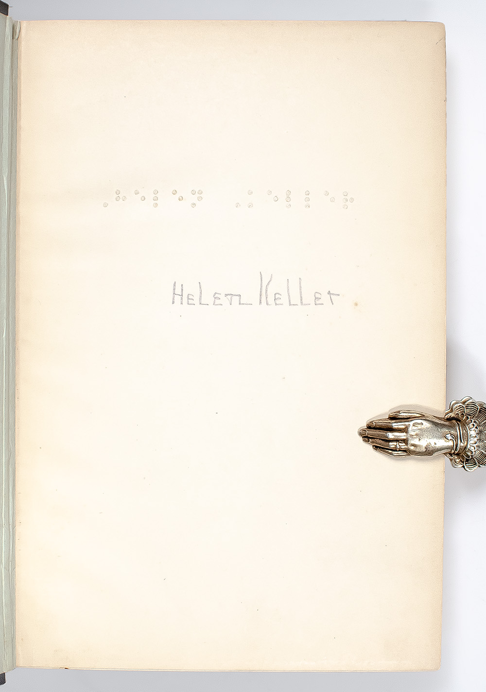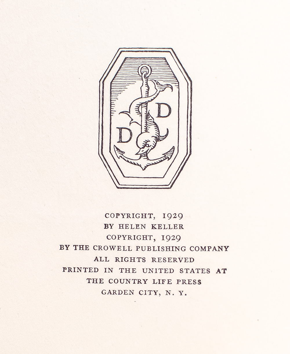 First edition of Keller's autobiography. Octavo, original cloth, illustrated with plates from photographs. Signed by the author in pencil on the front free endpaper, "Helen Keller," beneath her name embossed in braille. In very good condition with light toning throughout the textblock, lacking front free endpaper. Foreword by Nella Braddy.